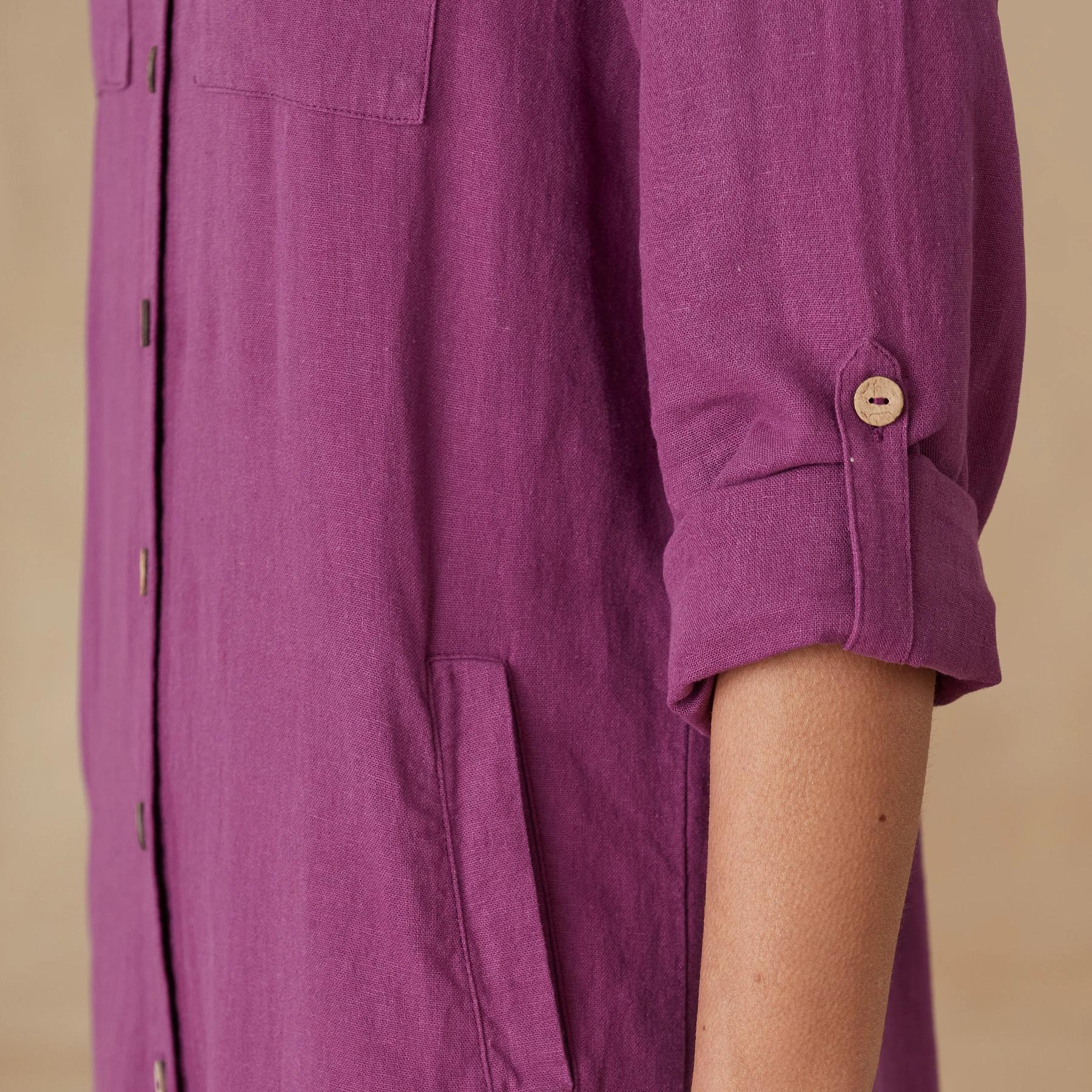 With its roll-tab sleeves and shirttail hem, this supple dress is the definition of easy comfort. Linen/rayon. Machine wash. Imported. XS (0 to 2), S (4 to 6), M (8 to 10), L (12 to 14), XL (16 to 18). Approx. 42″L.