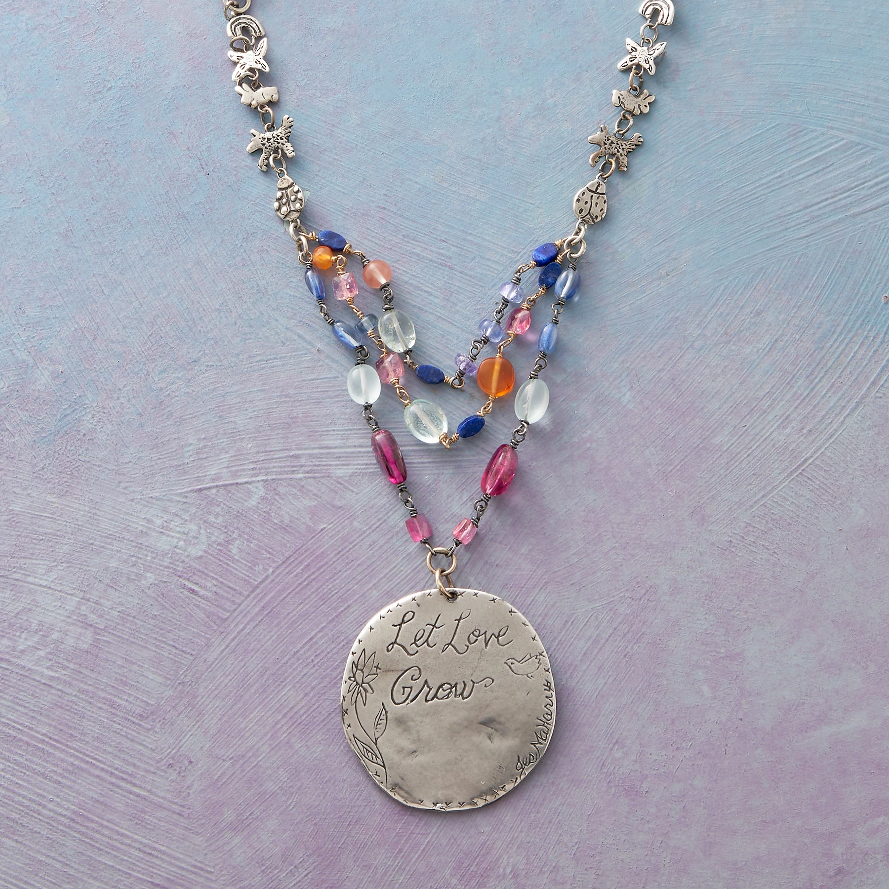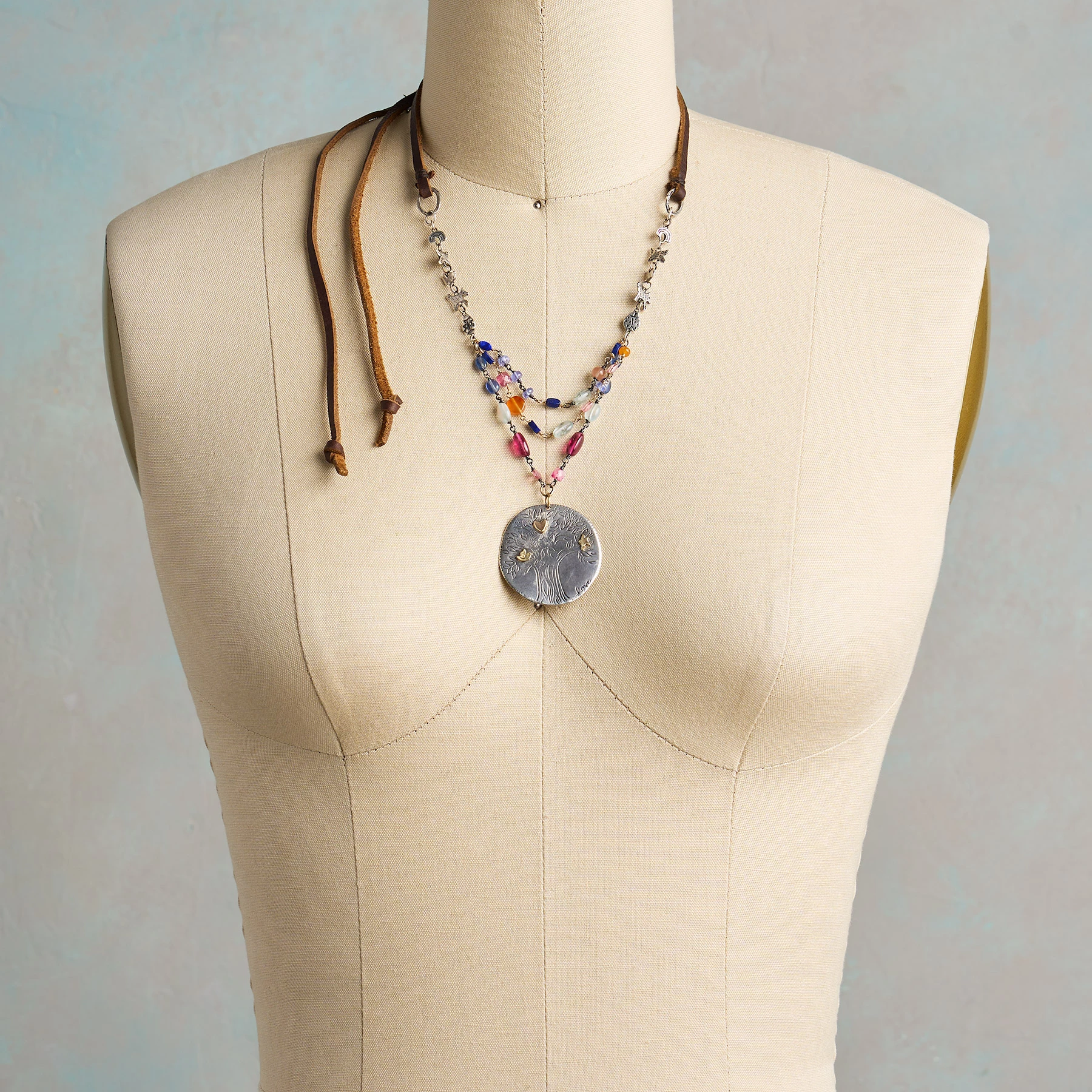 Symbols Handmade of 14kt gold alight on an oak etched in sterling silver. Gems include tourmaline, aquamarine and lapis. Leather lacing with slider to adjust length. “Let Love Grow” engraved on back. Exclusive. Made in USA by Jes MaHarry. 36″L; 1-1/2″ disk.