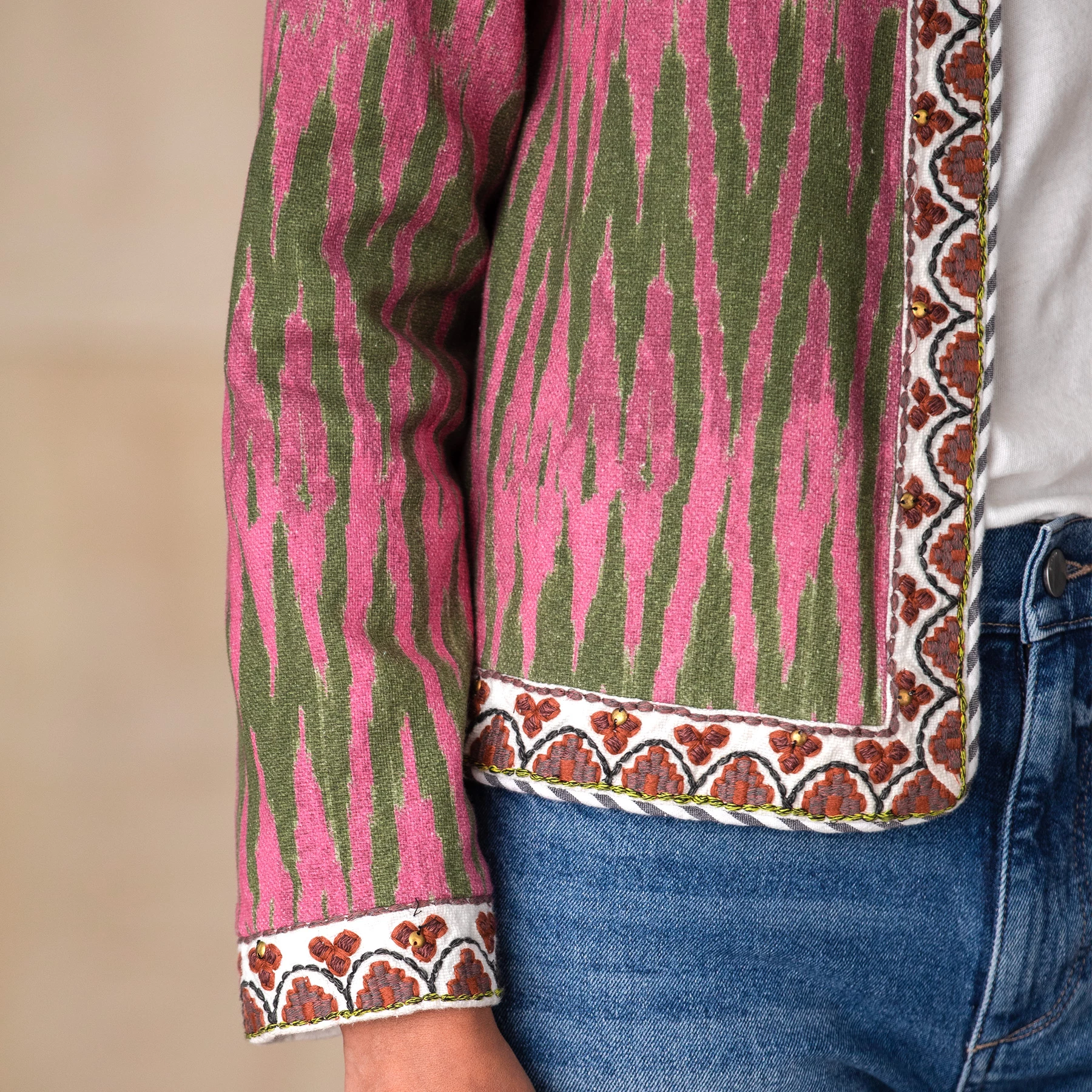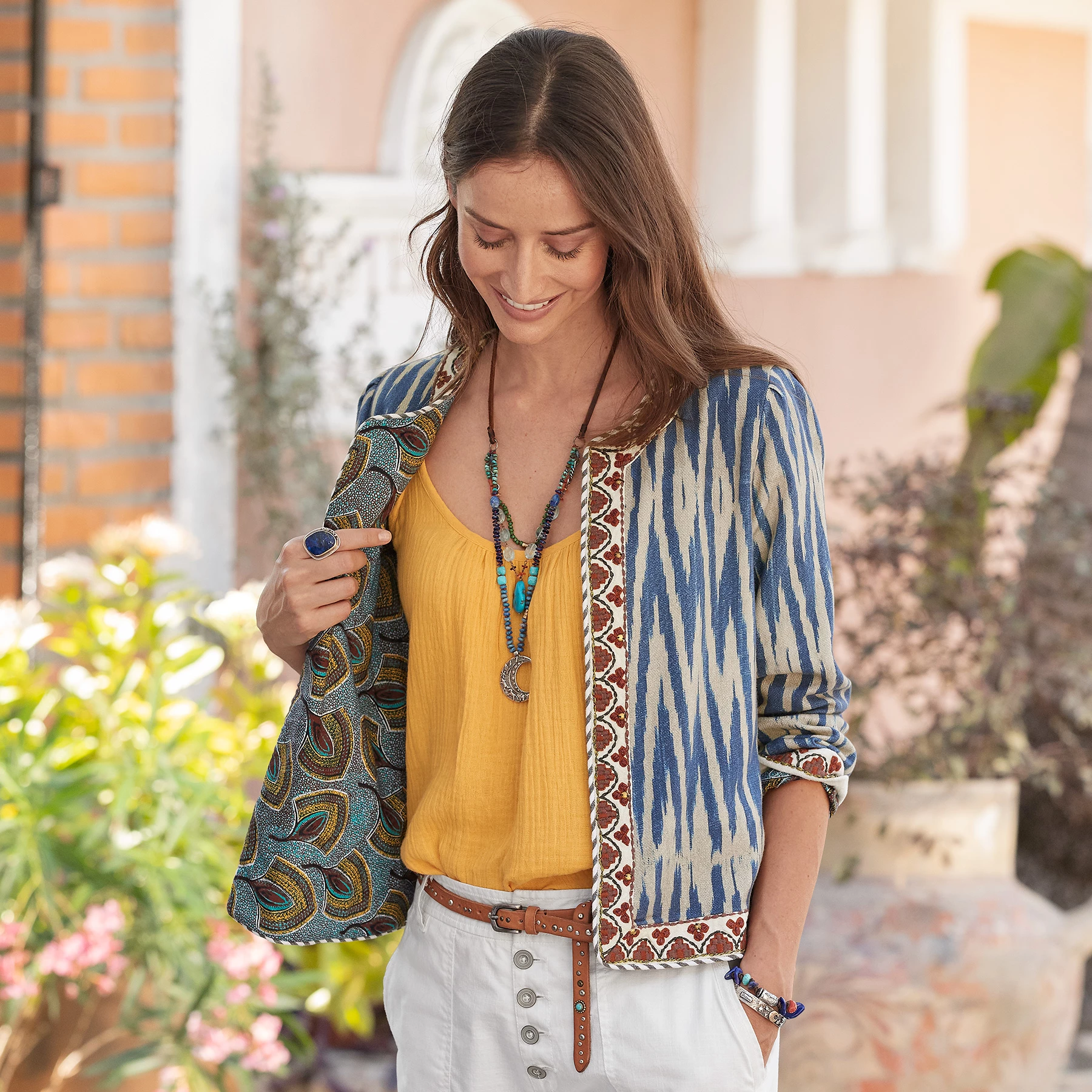 A wonderful, African-inspired ikat print with contrast vintage print lining in our semi-fitted, statement piece jacket with lush embroidery, tarnished metal beading and striped binding. Open front. Cotton. Machine wash. Imported. Exclusive. Sizes XS (0 to 2), S (4 to 6), M (8 to 10), L (12 to 14), XL (16 to 18), XXL (20 to 22). Approx. 22-1/2″L.