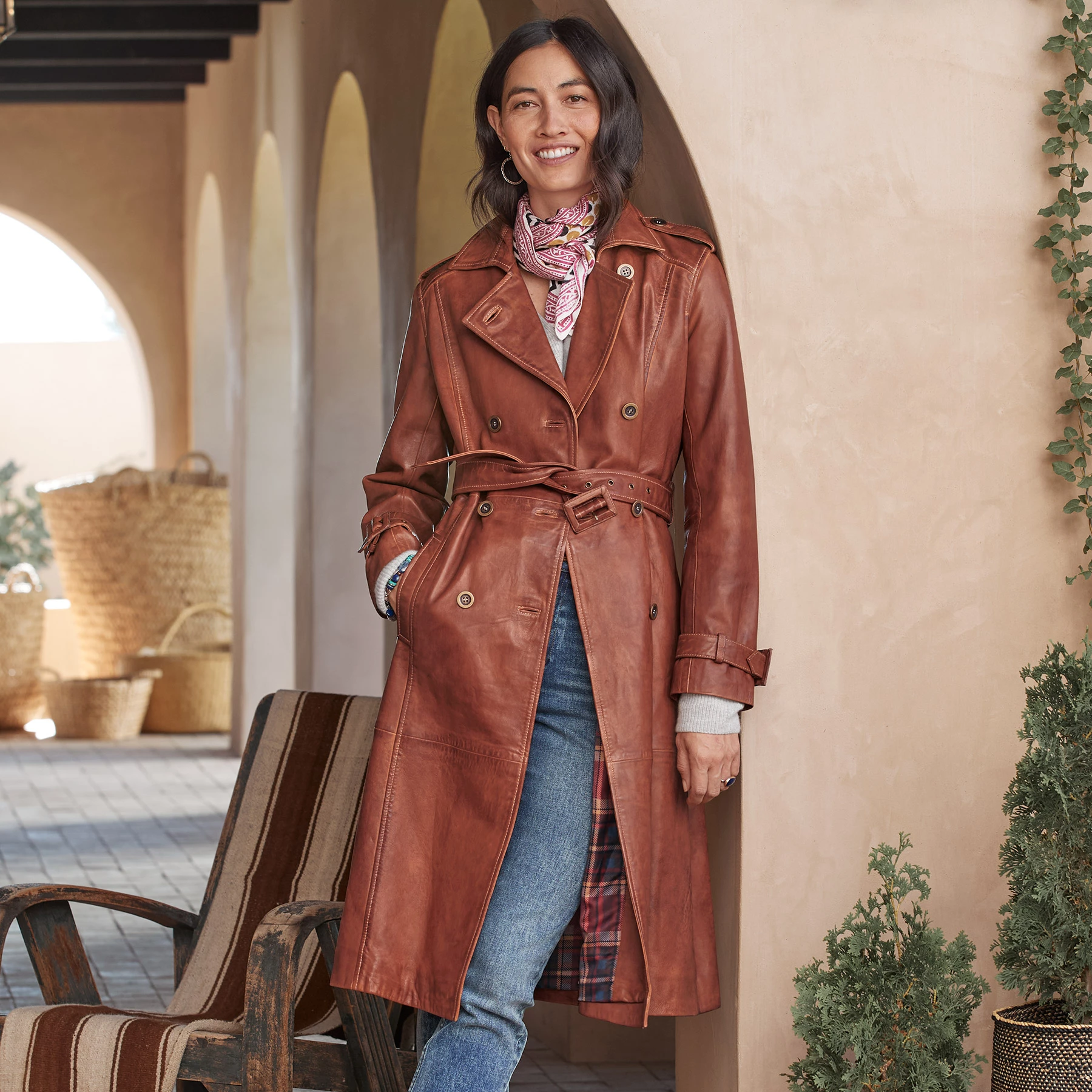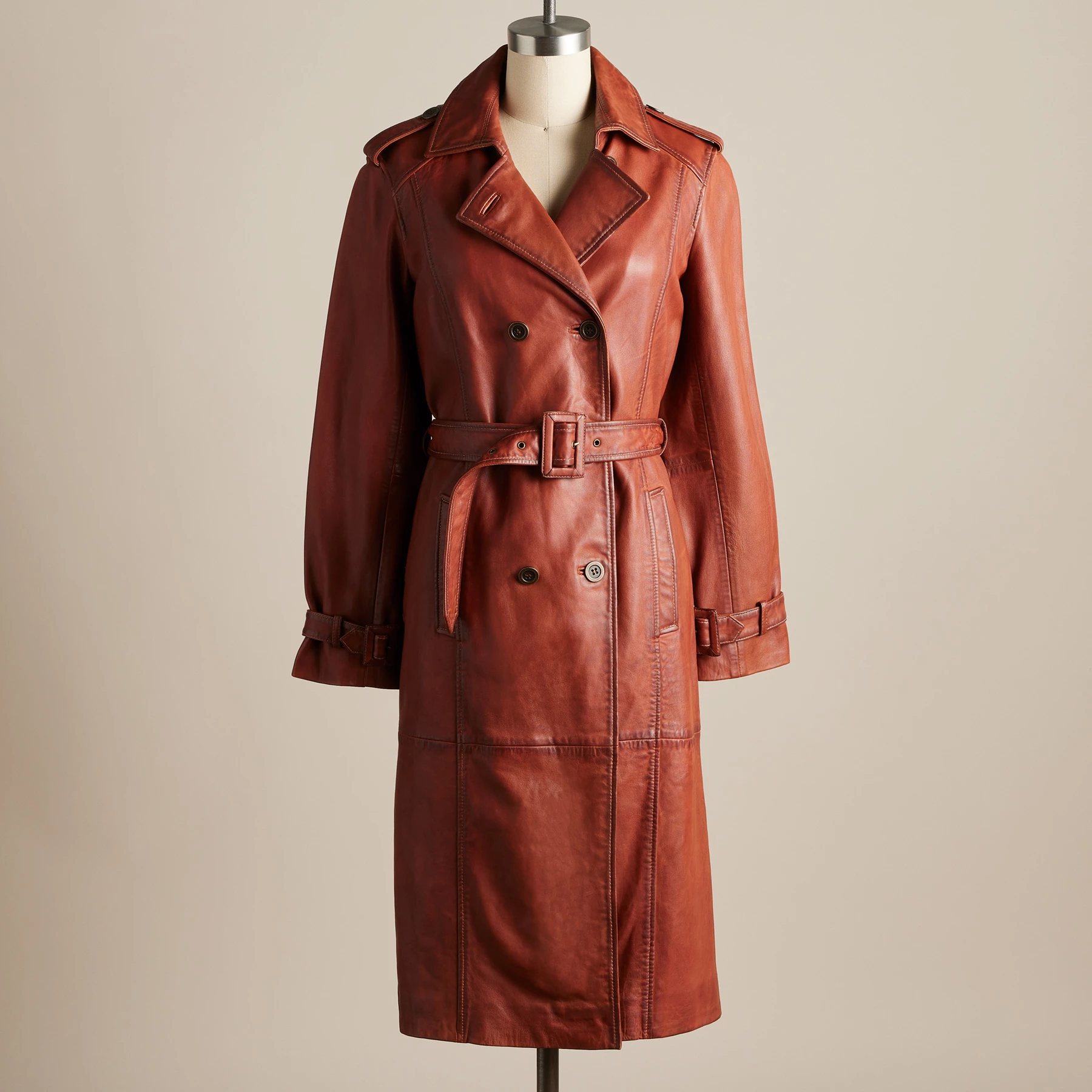 Definitive, refined style steals the show in this timeless, handcrafted, leather trench coat with seam details, side pockets and cuff details. Button closure. Fully lined. Dry clean. Imported. Exclusive. Sizes XS (0 to 2), S (4 to 6), M (8 to 10), L (12 to 14), XL (16 to 18), XXL (20 to 22). Approx. 44″L.