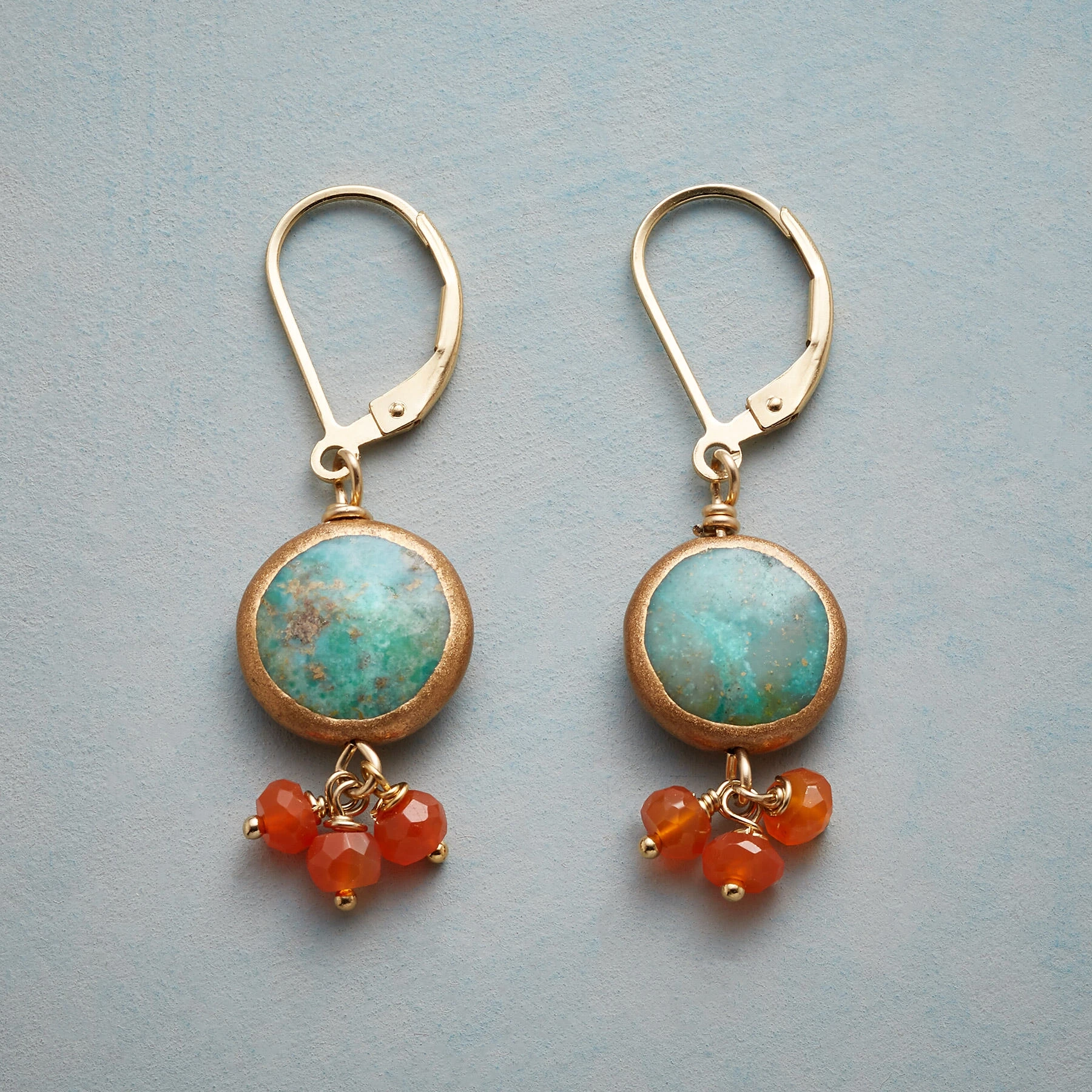 Copper-wrapped turquoise disks provide an earthy contrast to clustered carnelian rondelle trios hung below. 14kt gold-filled lever backs and wires. Exclusive. Handcrafted in USA. 1-1/2″L.