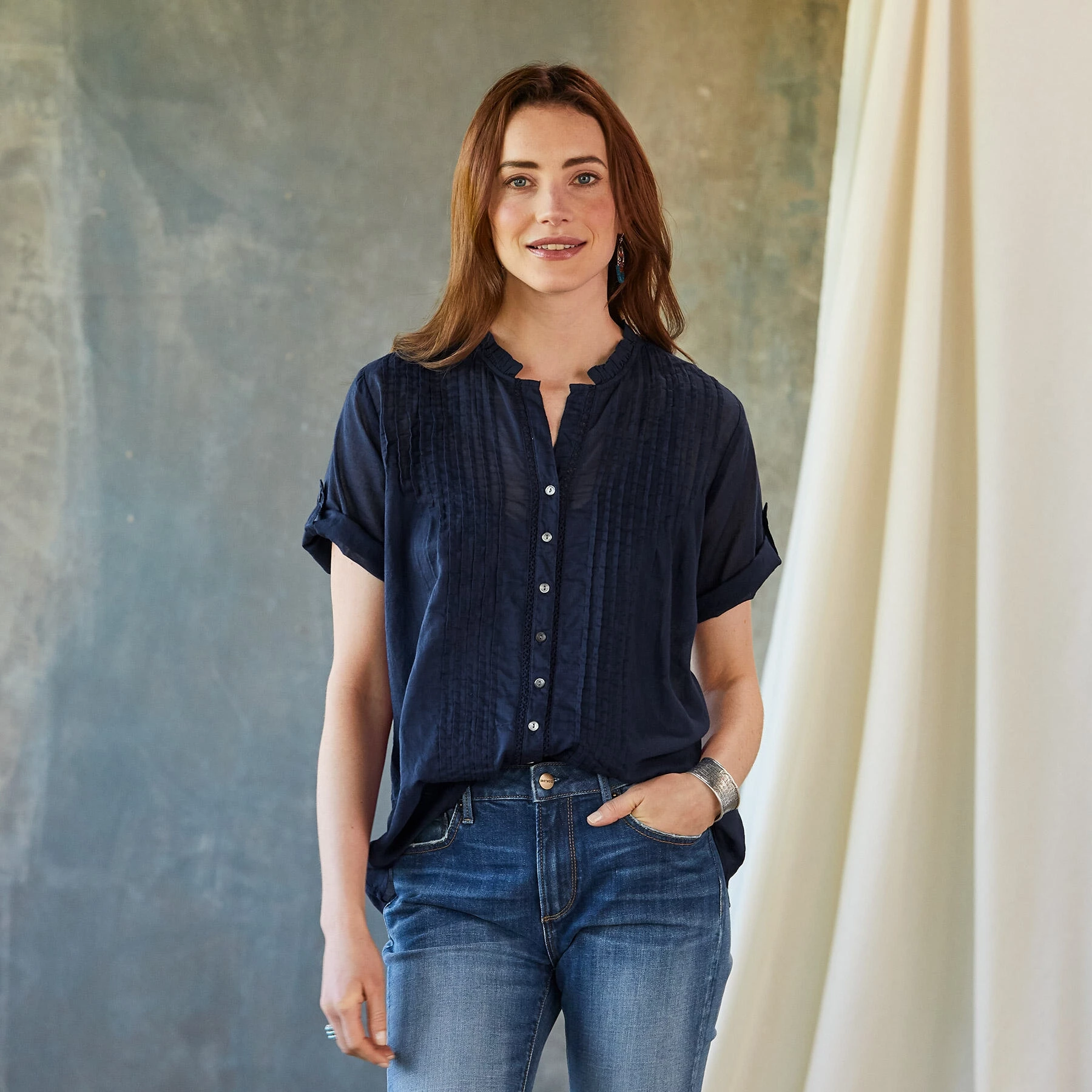 A sweet and feminine top in super fine, washed cotton, accented with a series of pintucks over a loose and flowing body with delicate lace inlay accents, ruffle collar, shell buttons and roll tab sleeves. Hand wash. Imported. Sizes XS (2 to 4), S (6), M (8 to 10), L (12), XL (14 to 16). Approx. 27″L.
