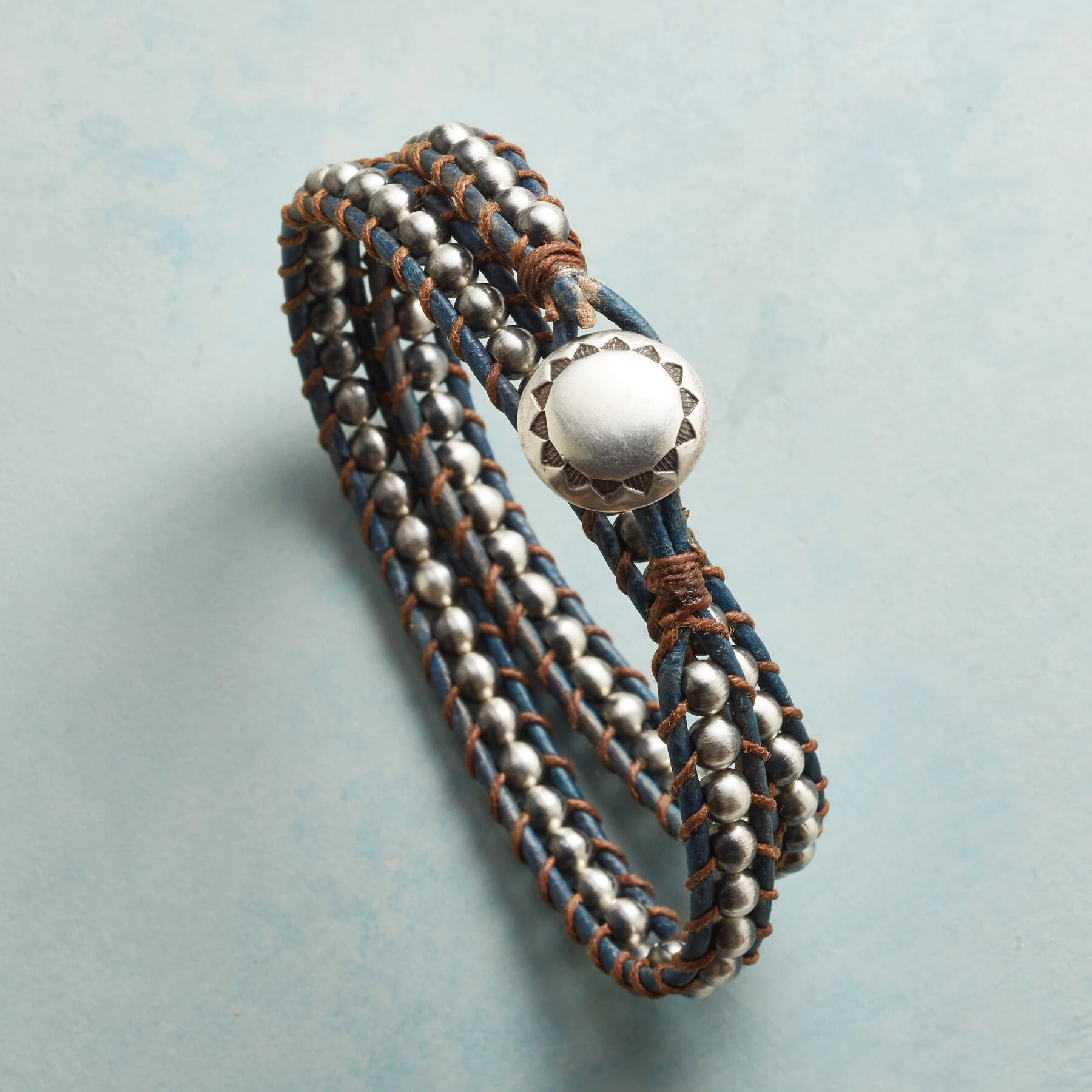 As comfortable as his favorite jeans, our wrap bracelet combines supple, indigo-hued leather with sterling silver beads and fastens with a handstamped sterling silver button and leather loop. USA. Exclusive. 16-1/2″L.