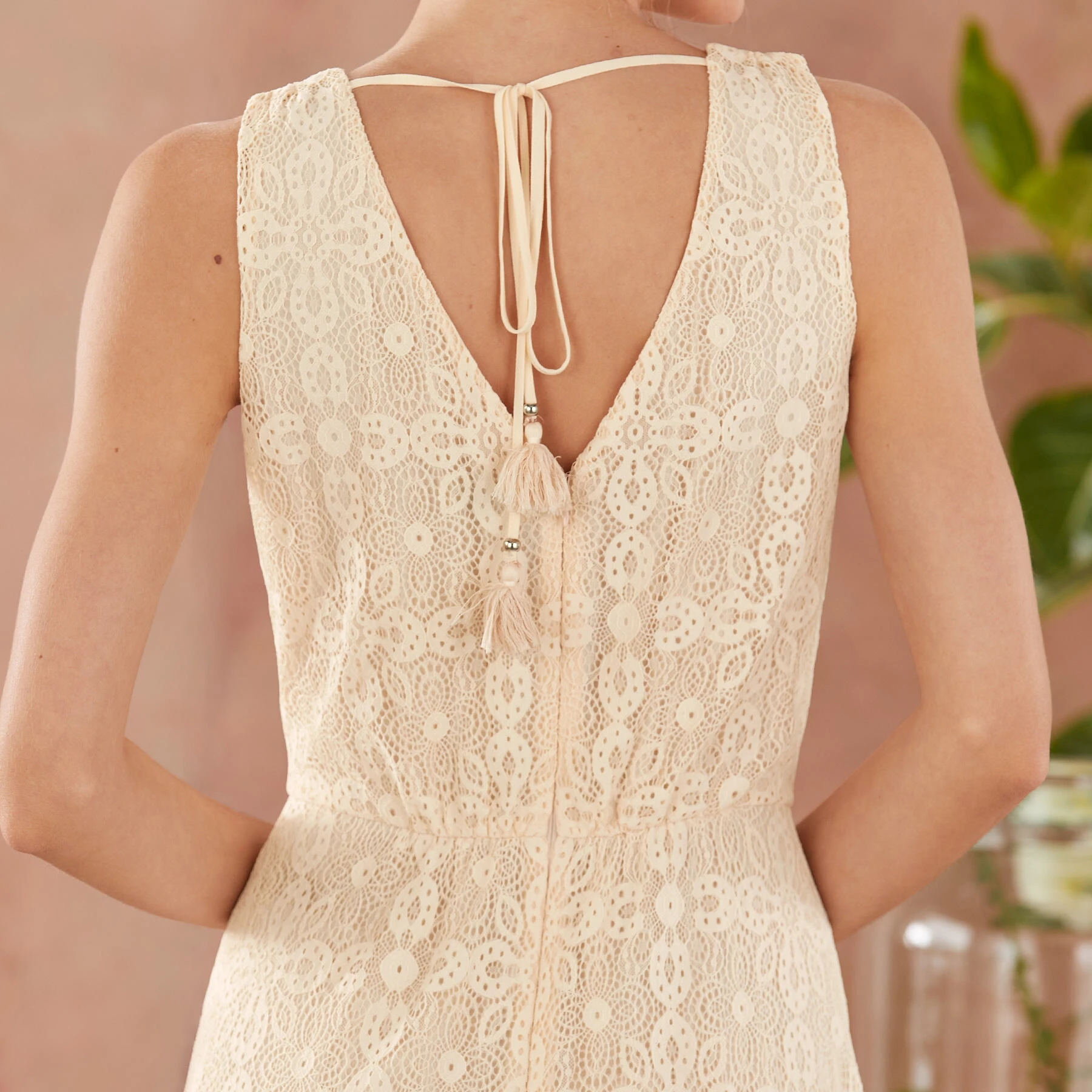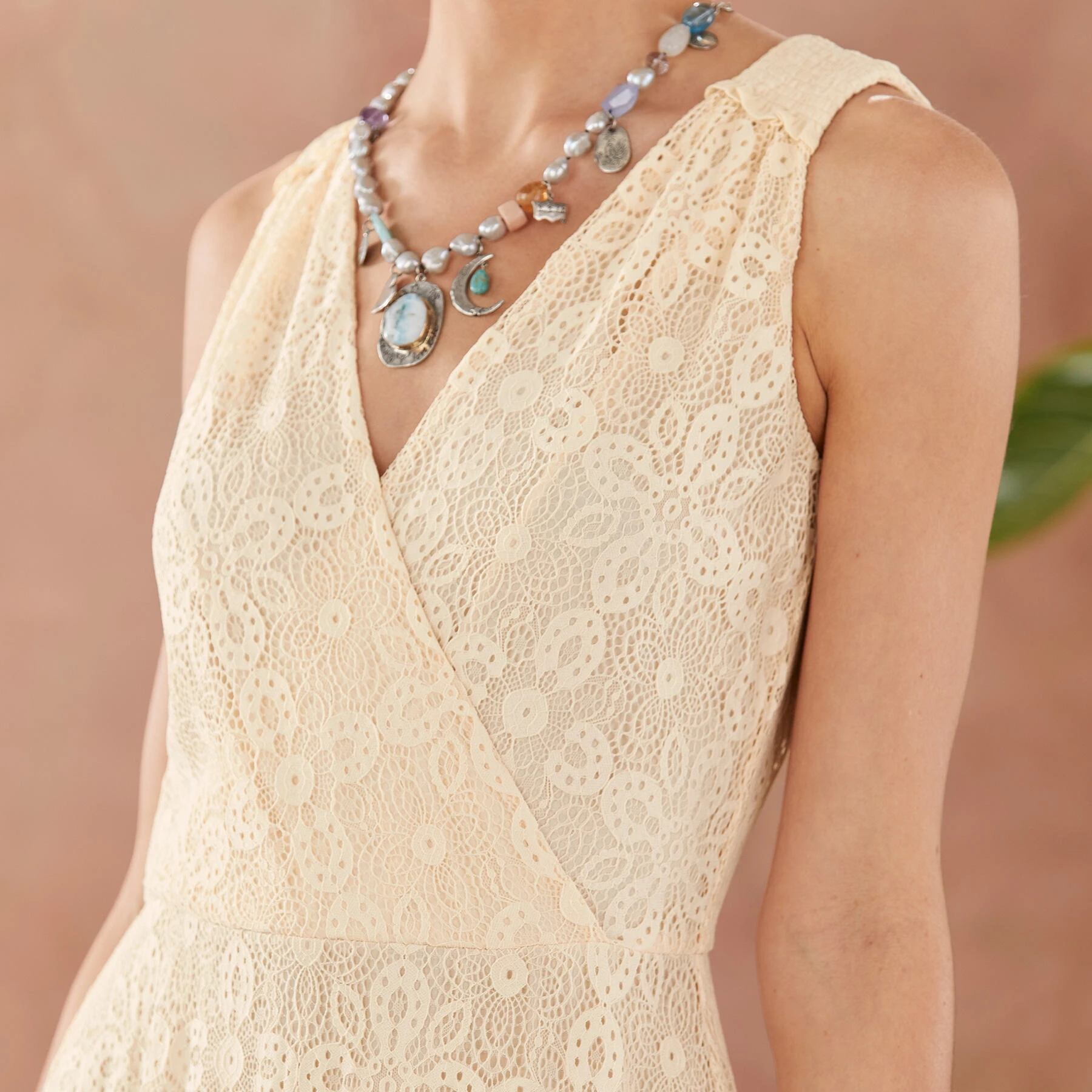 Turn heads in our sleeveless, faux-wrap maxi dress with allover lace, ruffles, V front and back with elegant ties. Nude lining. Back zip. Nylon/spandex. Hand wash. Imported. Exclusive. Sizes XS (0 to 2), S (4 to 6), M (8 to 10), L (12 to 14), XL (16 to 18), XXL (20 to 22). Approx. 58″L.