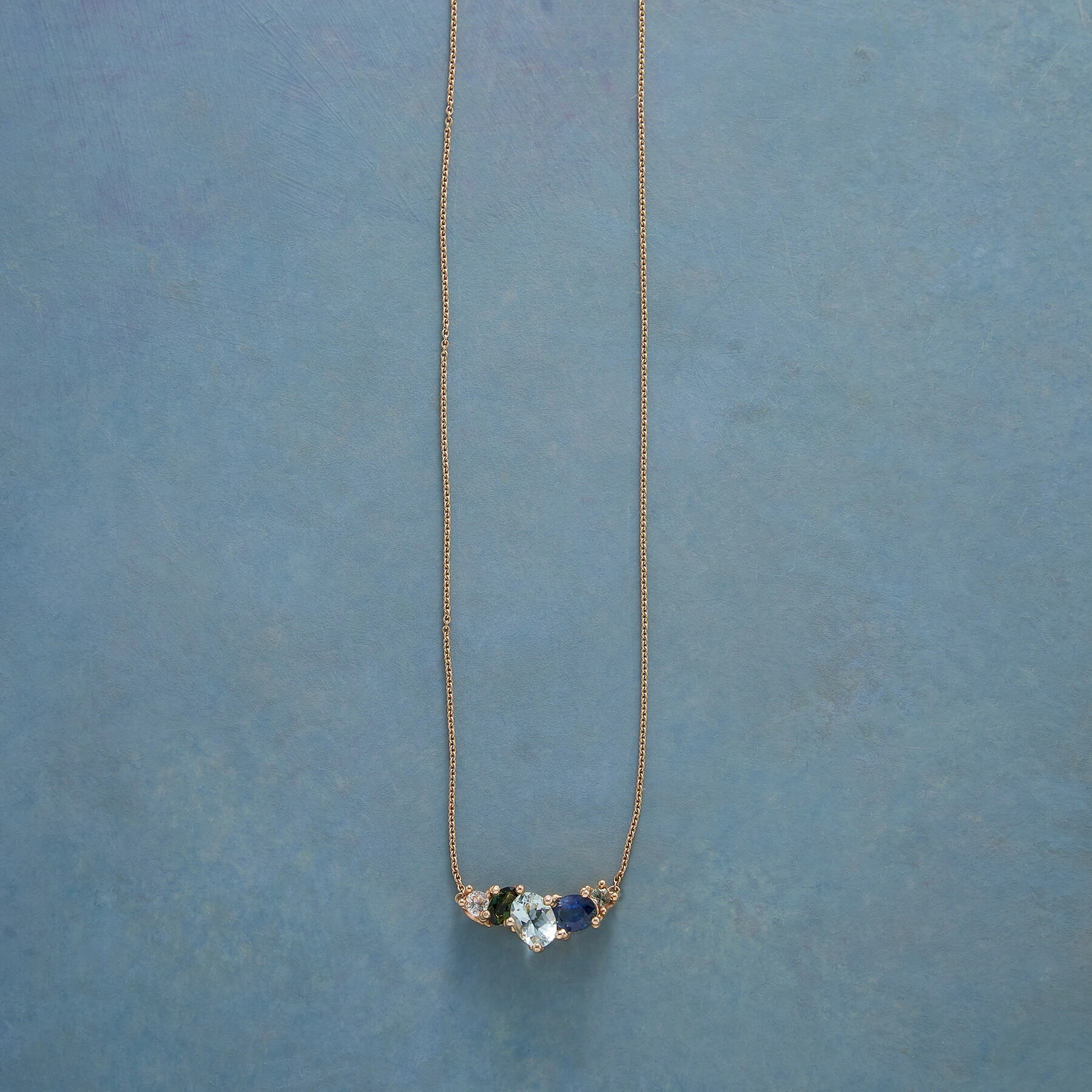 Ruth Tomlinson evokes the sea’s soothing palette and changing tides with her handcrafted 14kt yellow gold necklace centered with aquamarine, green tourmaline and blue, green and white sapphire shining amidst the artist’s signature gold granules. 14kt yellow gold fine link chain and spring clasp. 16″ or 18″L.
