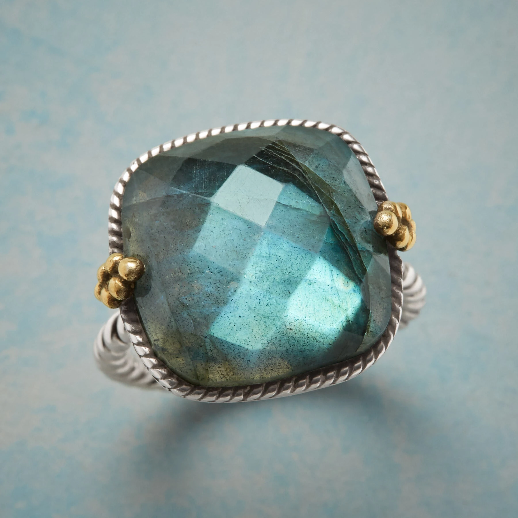Clusters of 14kt gold-plate beads flank either side of an abyss-like checkerboard faceted labradorite. Sterling silver rope bezel and band. Exclusive. Whole sizes 5 to 10.
