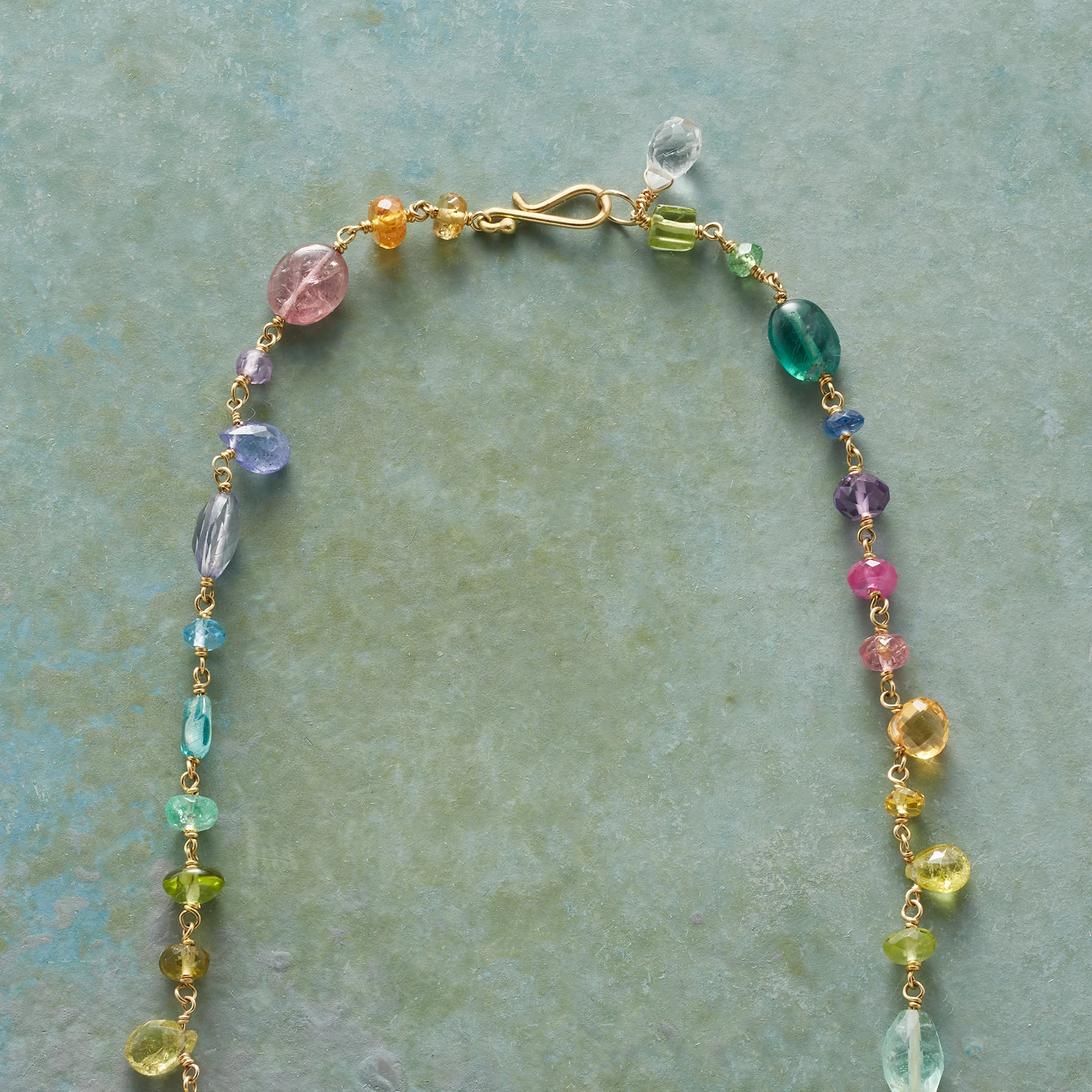 A painter’s palette of gemstones linked one to the next with 18kt gold. By Polly Hart with amethyst, iolite, sapphire and more. Hook clasp. Handmade in USA. 17″L.