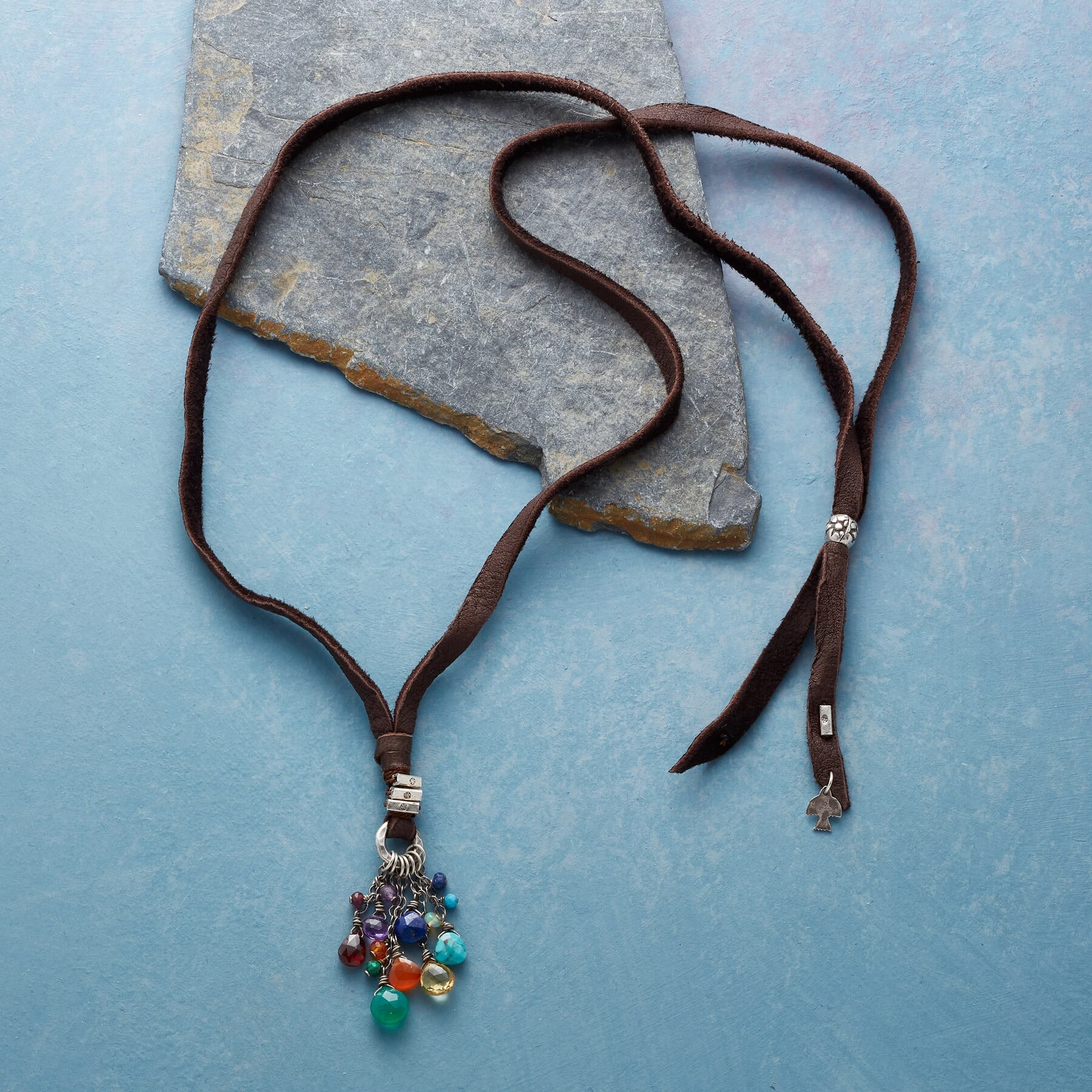 Lapis, turquoise, amethyst, citrine, opal and more cascade from a hammered sterling silver ring, looped onto leather laces that adjust with a sterling slider. Handcrafted Exclusive. 28″L, 1-1/2″ drop.