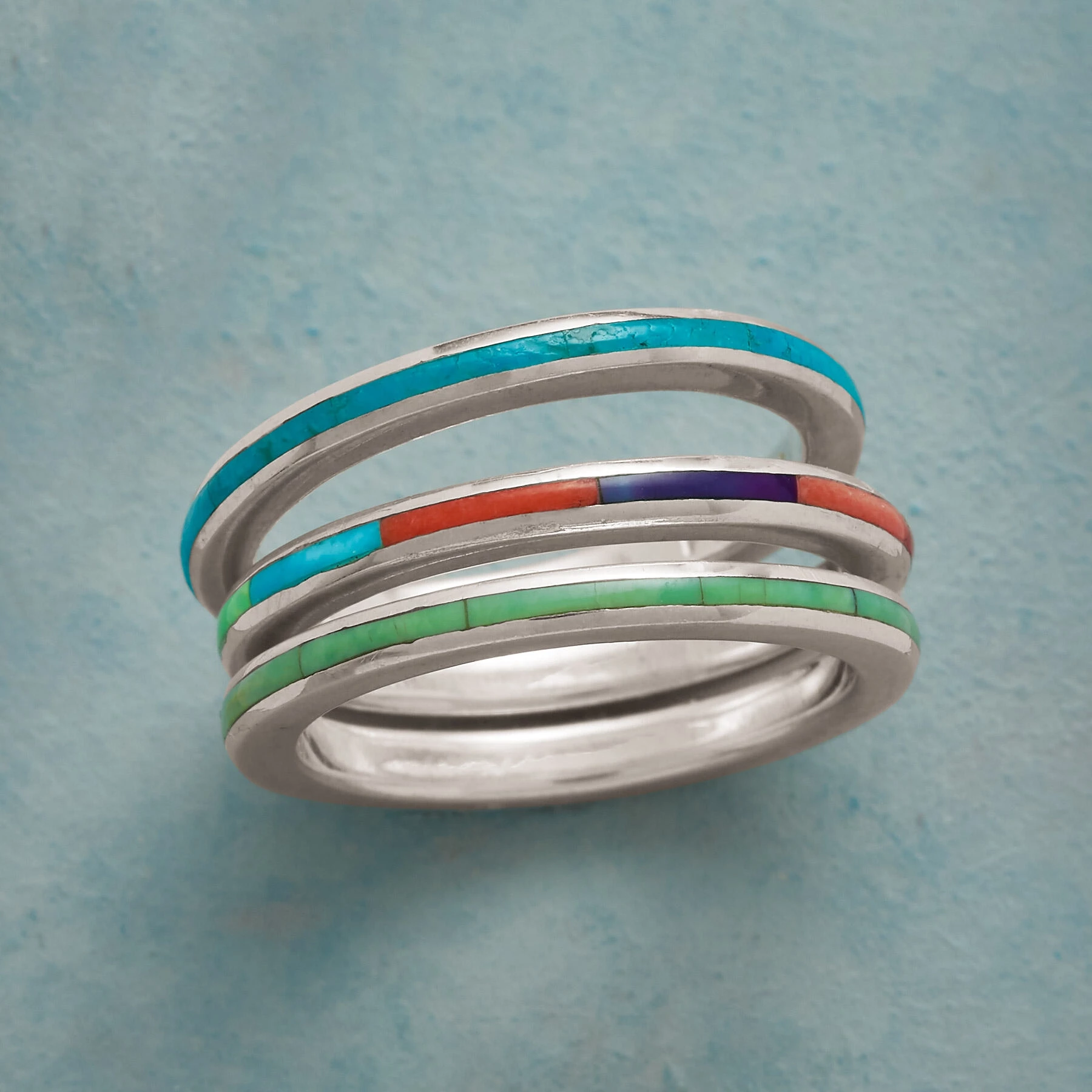 Three sterling silver bandsāinlaid with green and blue turquoise, purple and orange spiny oyster shell and lapisāstack together in colorful harmony. Handmade. Exclusive. Whole sizes 5ā9. Set of 3.
