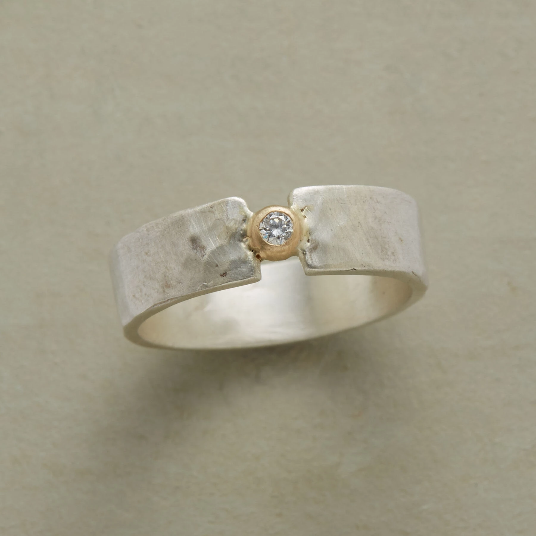 One diamond in a 14kt gold bezel bridges the gap on Kyoko Honda’s split band of hammered sterling silver. Matte finish showcases the gem. Ring handmade in USA. Whole sizes 5-9.