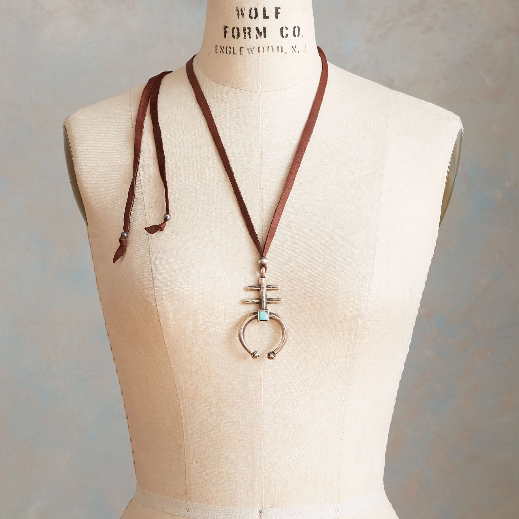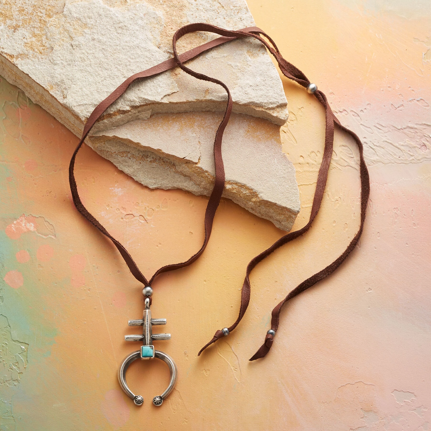 The combination of two traditional Native American motifs—the Naja and the dragonfly—add a striking, sculptural element to this handcrafted necklace by the Southwestern artist known only as Buffalo. Hanging from supple leather and hand-forged of sterling silver, the pendant bears subtle etch marks and is set with Kingman turquoise. Sterling silver slider. USA. Exclusive. 42″L; Naja 2-3/4″L x 1-5/8″W.