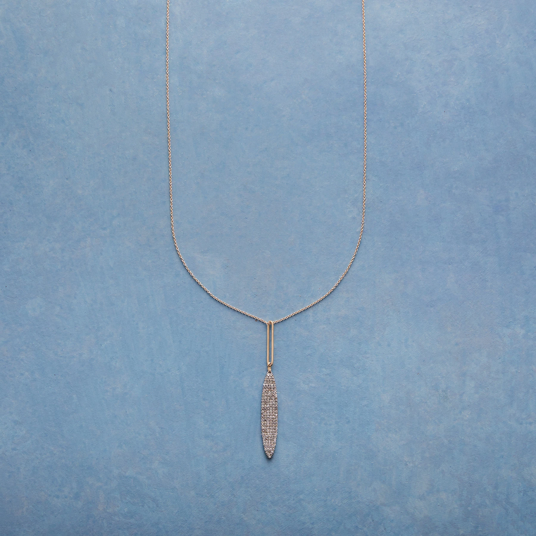 Pavé diamonds light up a long, lovely pendant while a 14kt gold oval echoes its elegant shape. 14kt gold chain and lobster clasp. Handcrafted in the USA by Dana Kellin. 28″L, 2-1/2″ drop.