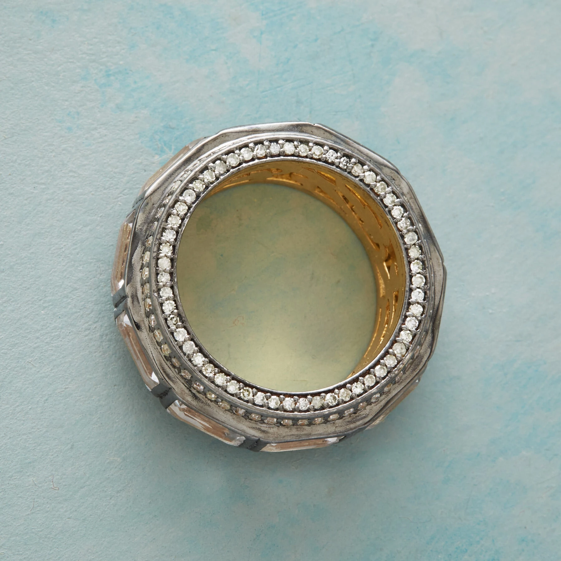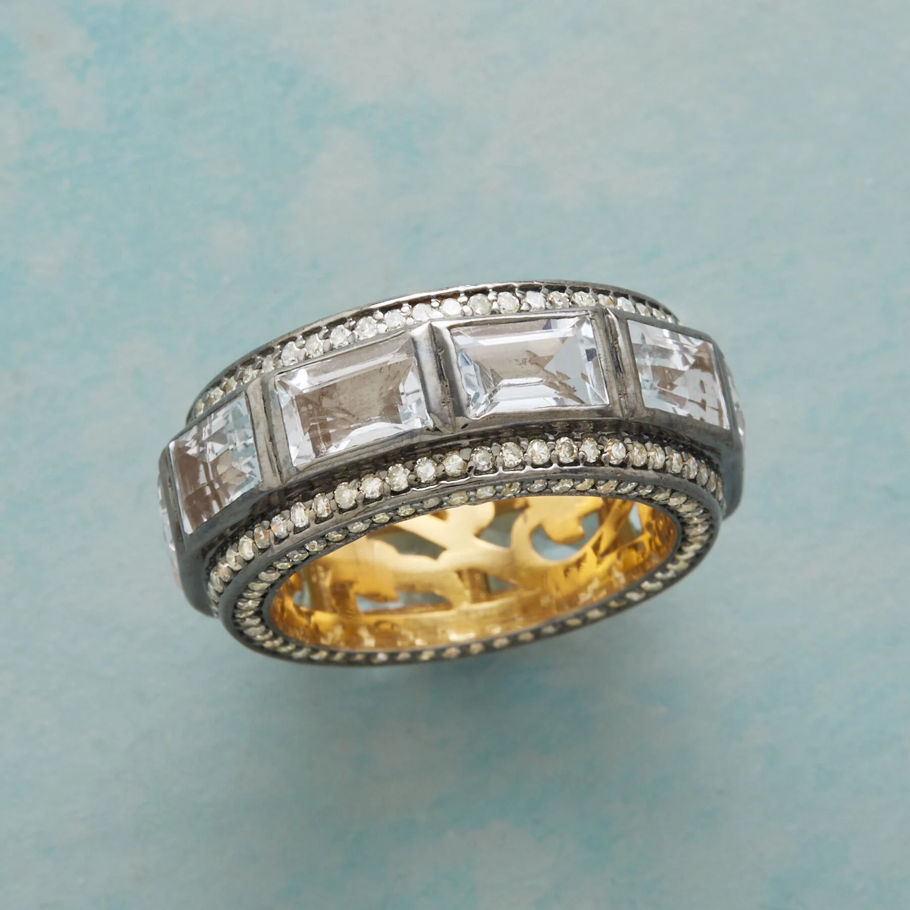 Baguette-cut aquamarines circle our handcrafted 18kt gold-plated ring, shored by diamonds and recessed with blackened lowlights. Exclusive. Whole sizes 6 to 9.