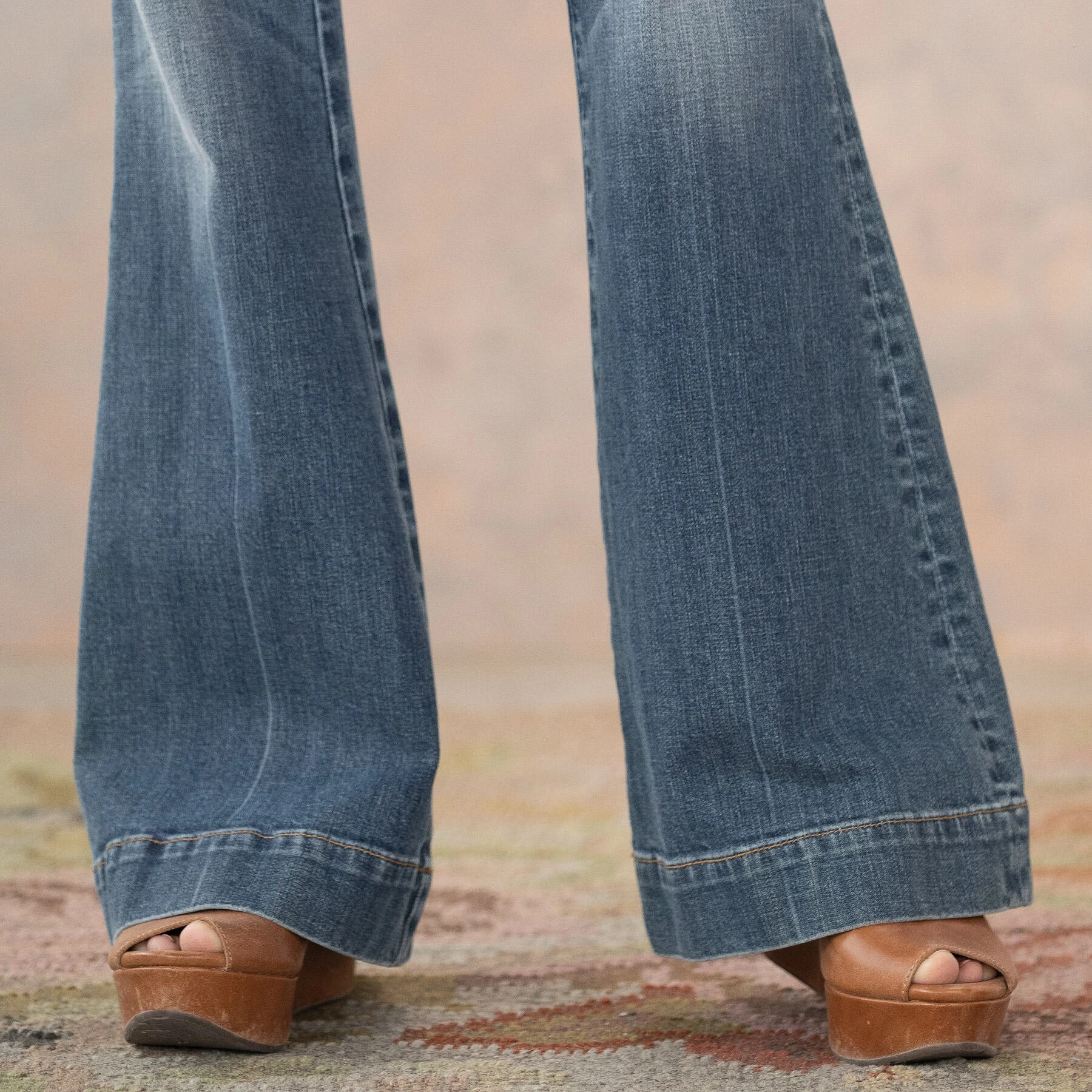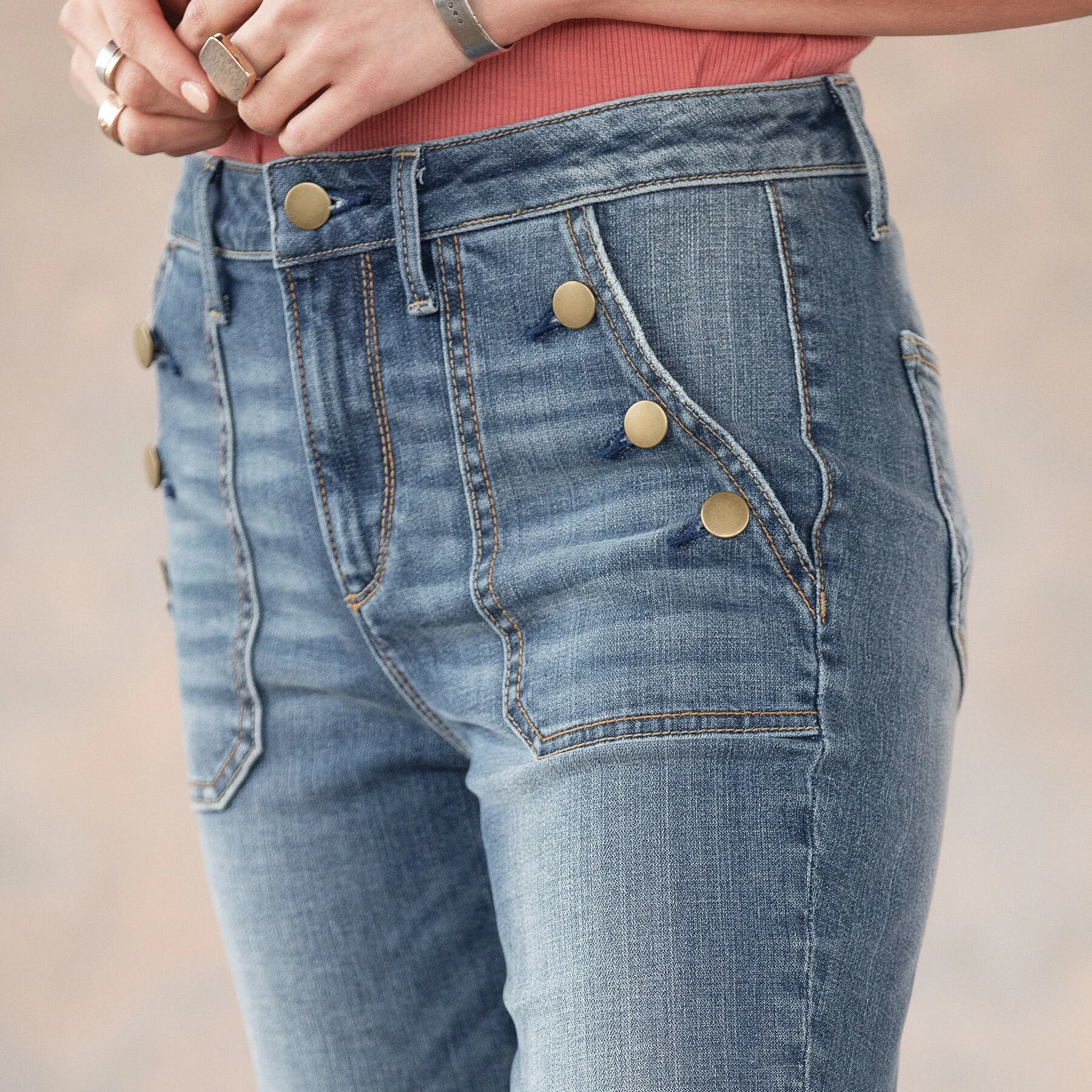 So flattering, Driftwood’s flared-hem, whiskered and blasted jeans with slimming back seams and sailor-inspired button detail. Cotton/spandex. Machine wash. Imported. Sizes 24 to 32. 32″ or 34″ inseam, 10″ rise, 24″ leg opening.