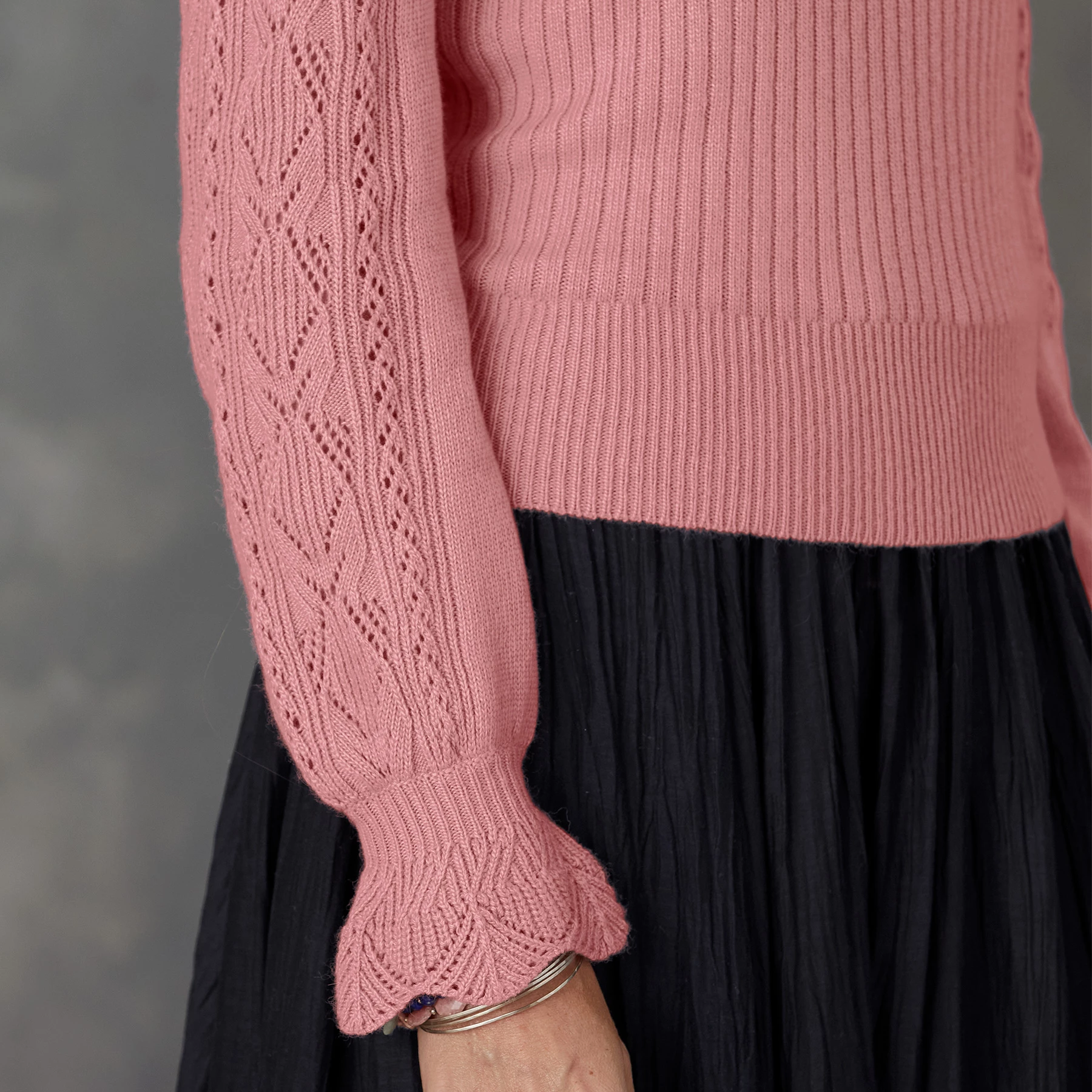 Pointelle puff sleeves with ruffled cuffs lend an elegant, airy feel to this ribbed scoop neck sweater. Viscose/nylon/wool. Hand wash. Imported. Sizes XS (0–2), S (4–6), M (8–10), L (12–14), XL (16–18), XXL (20–22). Approx. 22″l.