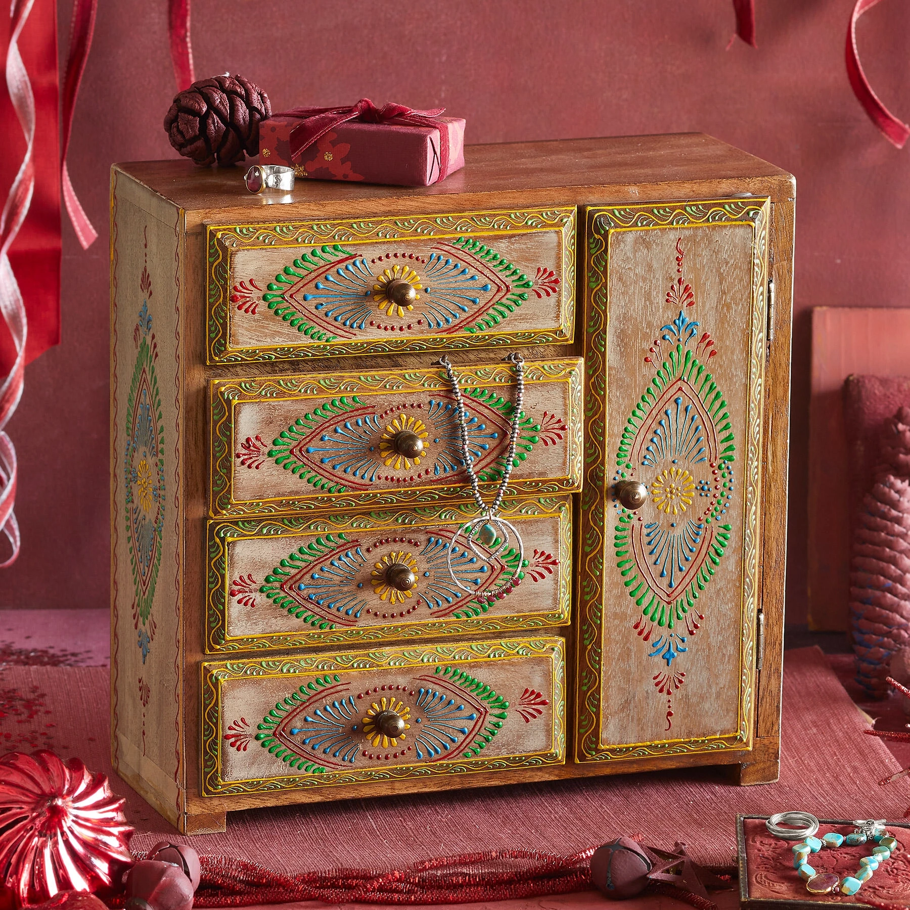 Handpainted in colors and flourishes reminiscent of Italian frescoes, our ‘Firenze’ jewelry bureau offers a beautiful home for rings in its drawers and necklaces on the side. Imported. Exclusive. 11-1/4″W x 4-1/2″D x 11-1/4″H.