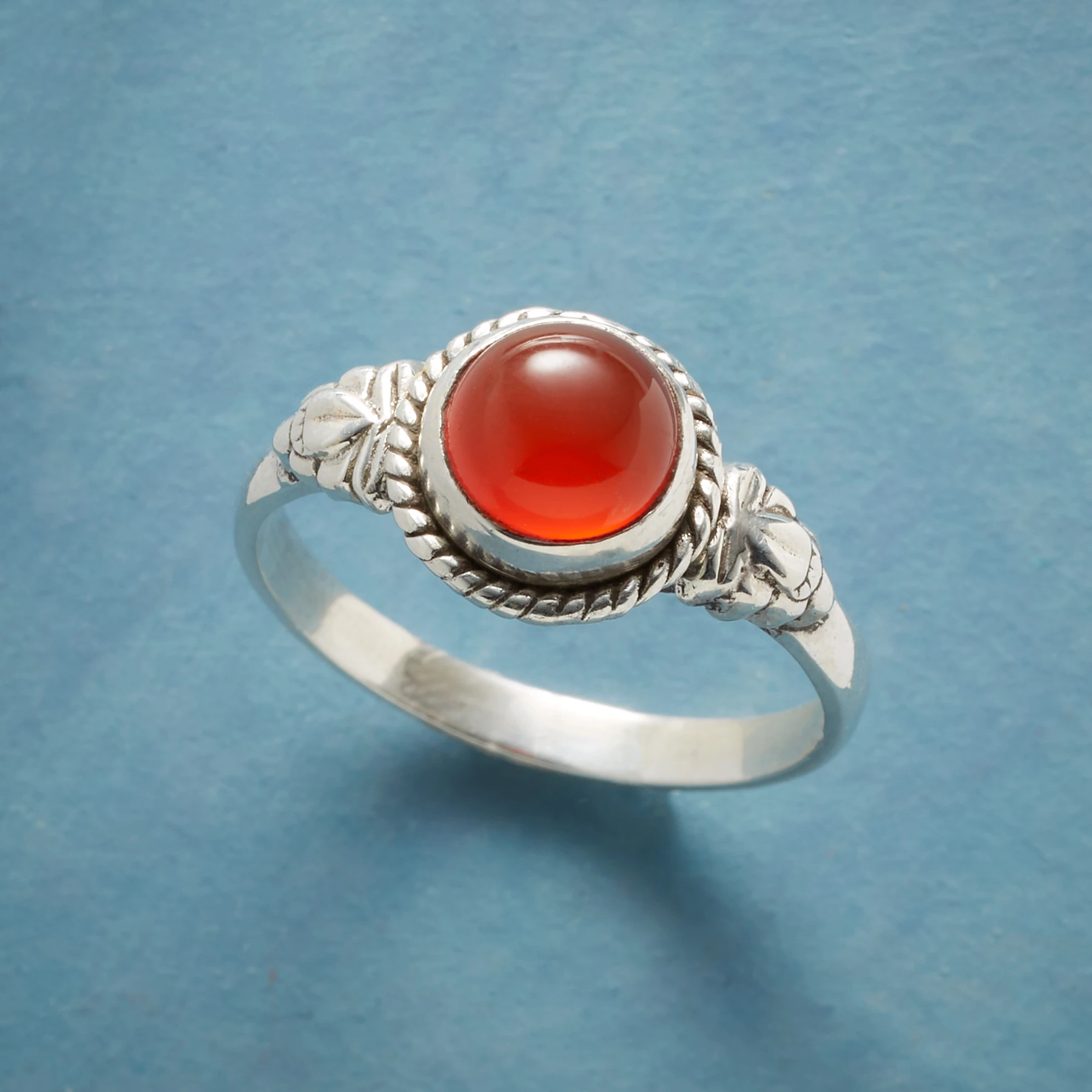 Amid leaf-like castings of sterling silver, a carnelian cabochon rises up from a roped surround. Handcrafted. Exclusive. Whole sizes 5 to 10.