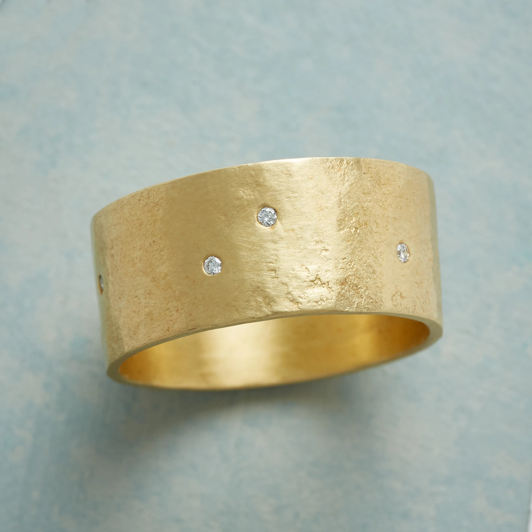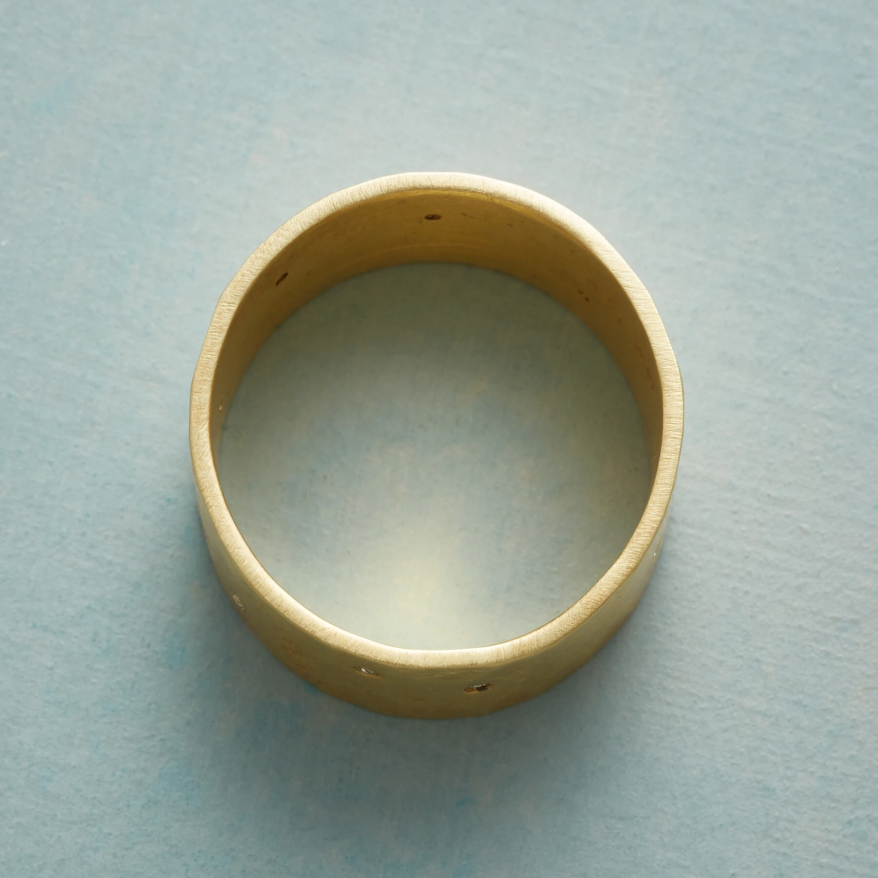 Meant to be, an 18kt yellow gold band is hand forged and hammered, creating a lightly textured effect. Set with a scattering of diamonds that sparkle all around, it leads the way, lighting up your life. Handcrafted in the USA by Sarah McGuire. Whole sizes 5 to 9. 5/16″L.