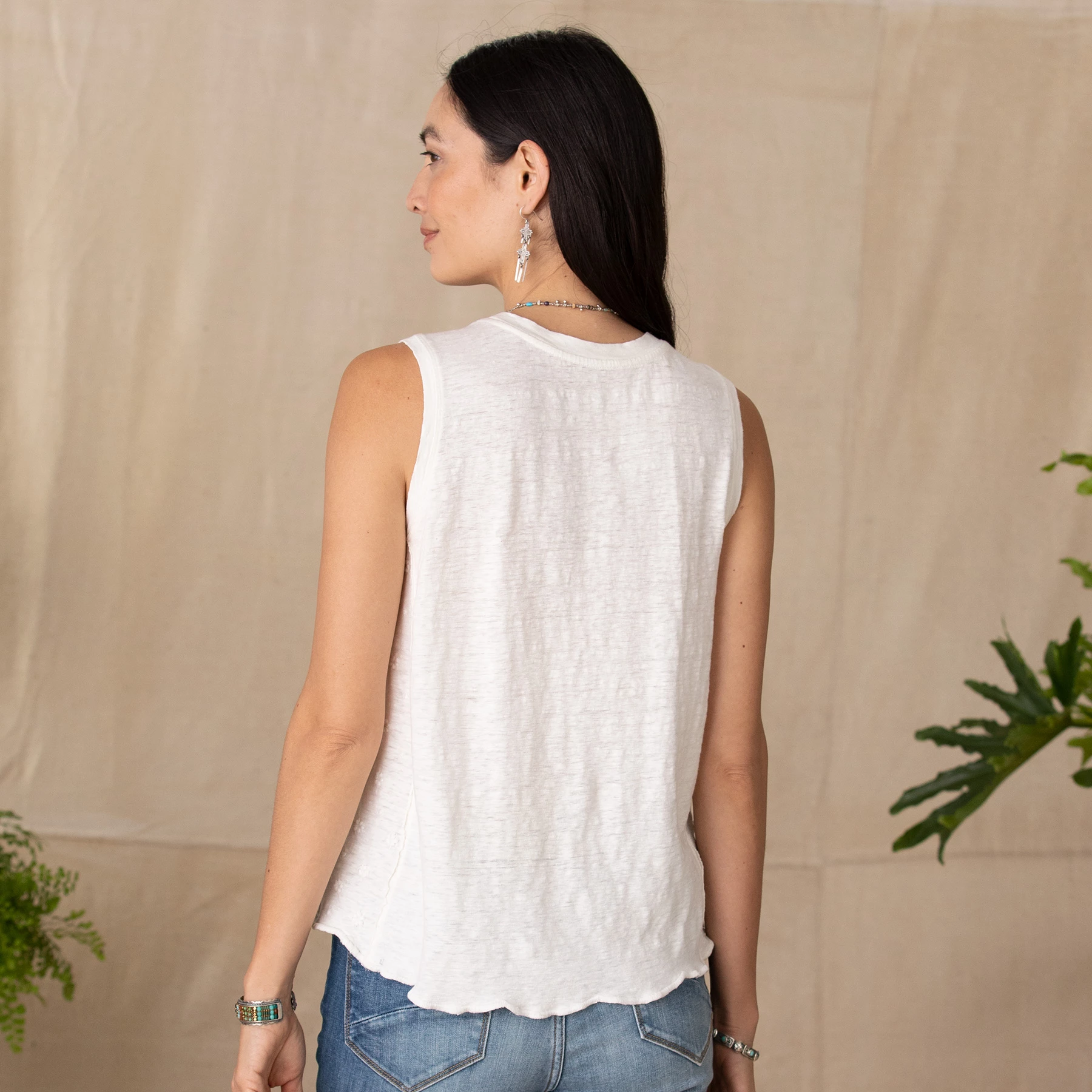 A true statement piece, our breezy linen tank embellished with tonal embroidery, French knot and raw-edge details, scalloped hem and embroidered side panels. Hand wash. Imported. Exclusive. Sizes XXS (00), XS (0 to 2), S (4 to 6), M (8 to 10), L (12 to 14), XL (16 to 18). Approx. 22″L.