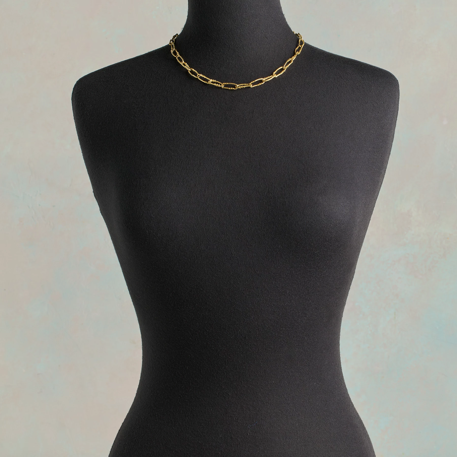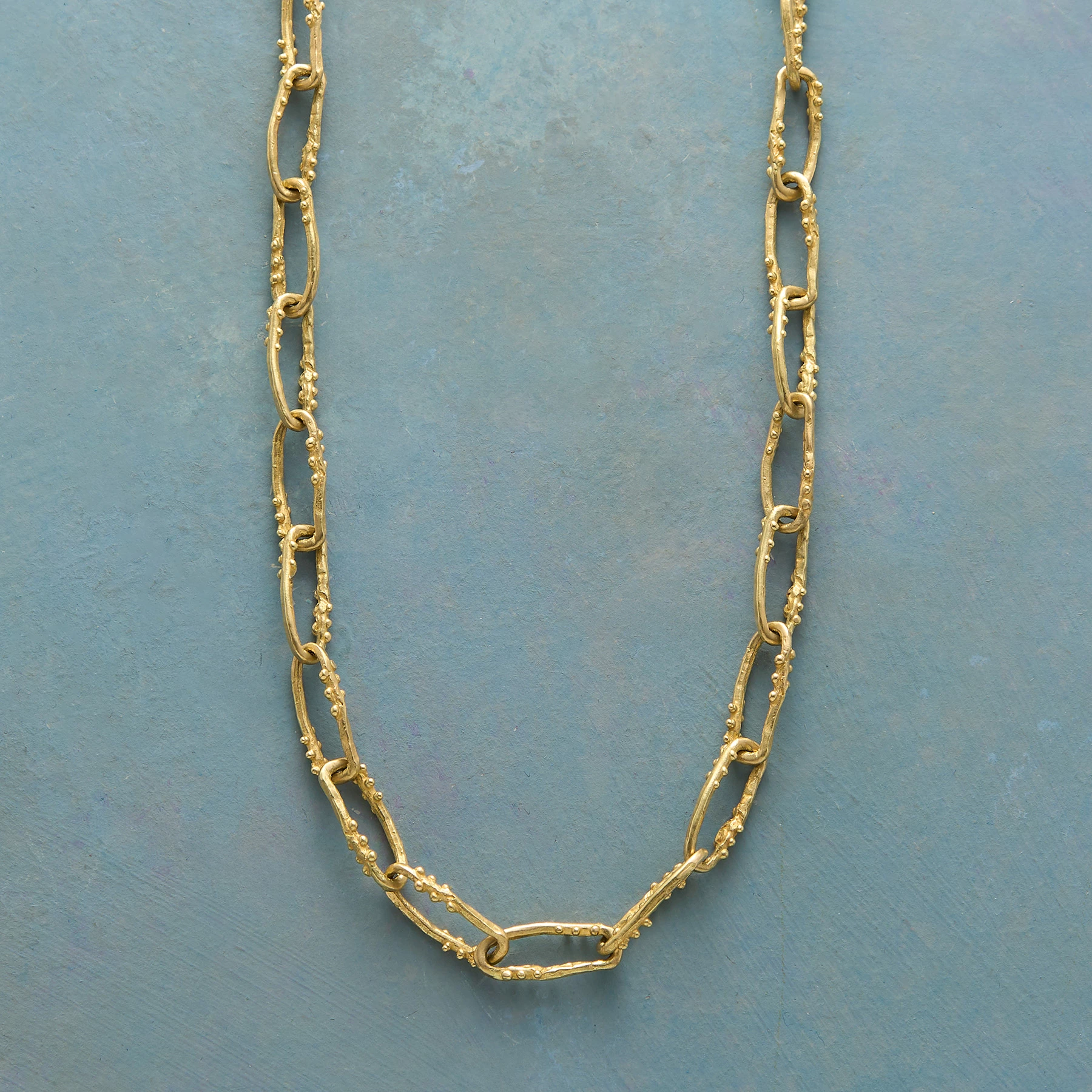 Forged with love, this handmade necklace by Jes Maharry brings together 18kt yellow gold links, each wonderfully textural and organic in form. The necklace fastens with an 18kt yellow gold lobster clasp and has a 14kt yellow gold tag etched with Jes’s name. Made in USA. Exclusive. 18″l, 5/8″l links.