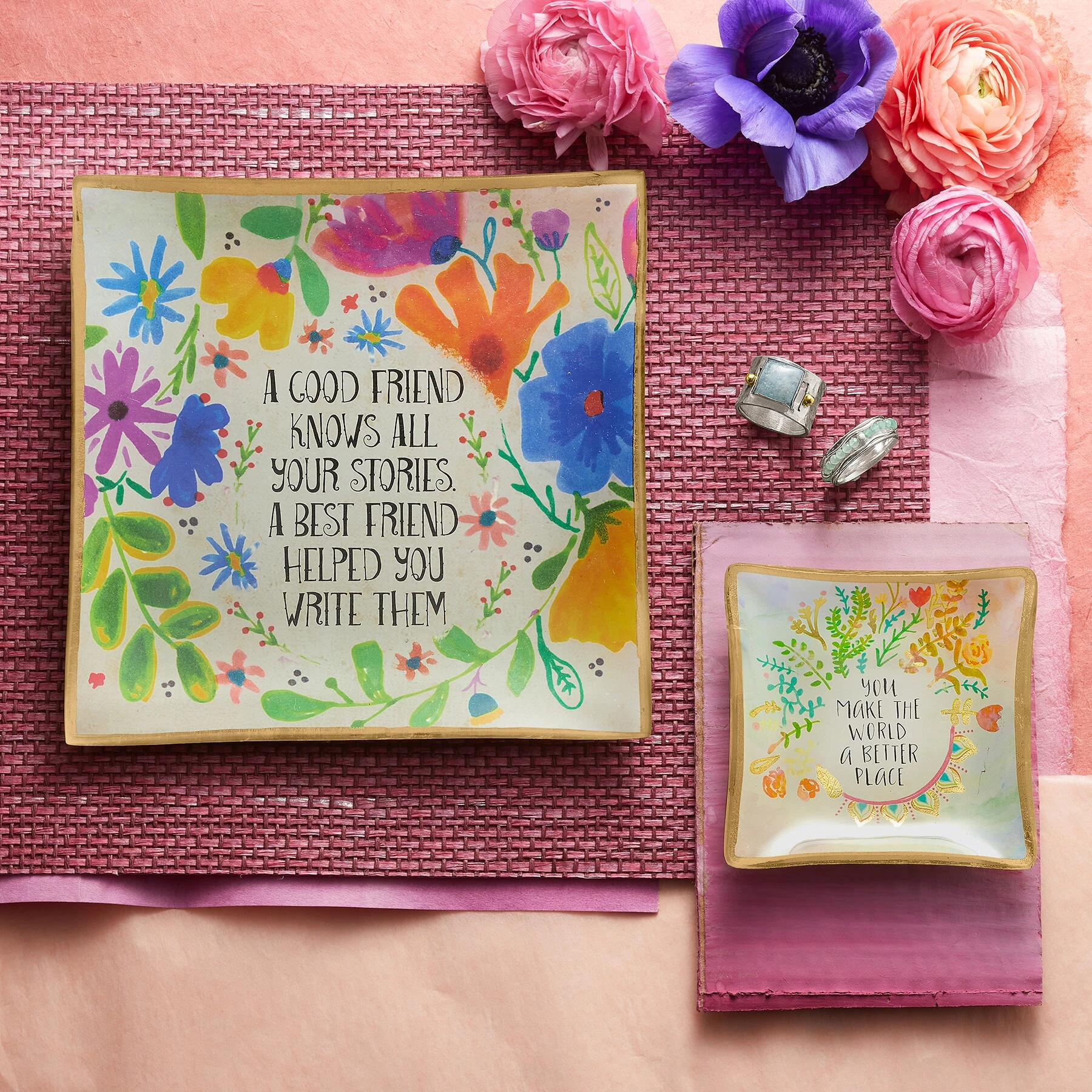 Every good friendship has a story, every true friend helped you write yours; give a gift of love to your true friend with this painted glass dish beautifully detailed with gold foil. Approx. 6″ sq.