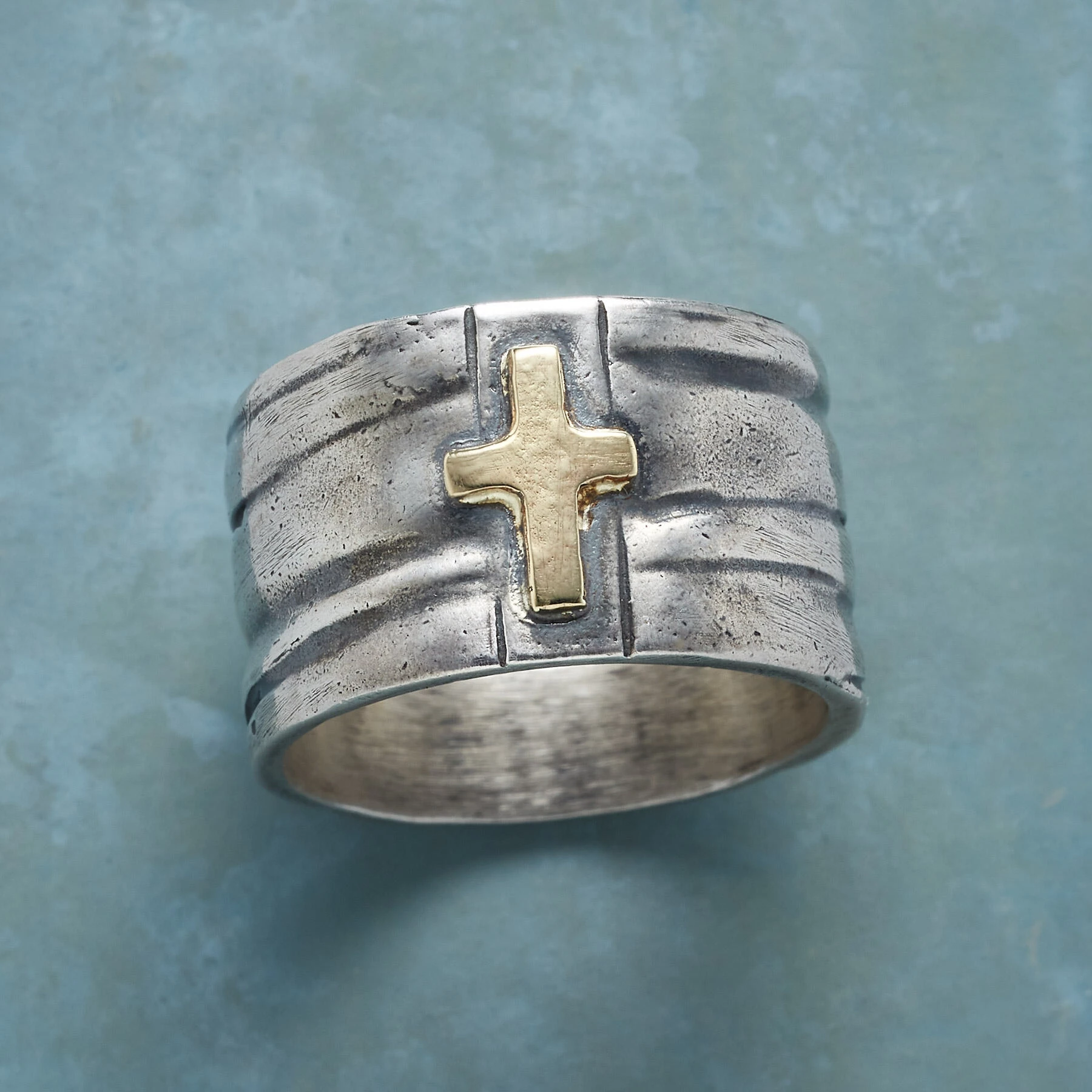 Our band’s rich texture was carved in wax, hand cast in sterling silver, then oxidized to enhance depth. The focal point is a 14kt gold cross. Exclusive. Whole sizes 5-9. 1/2″w.