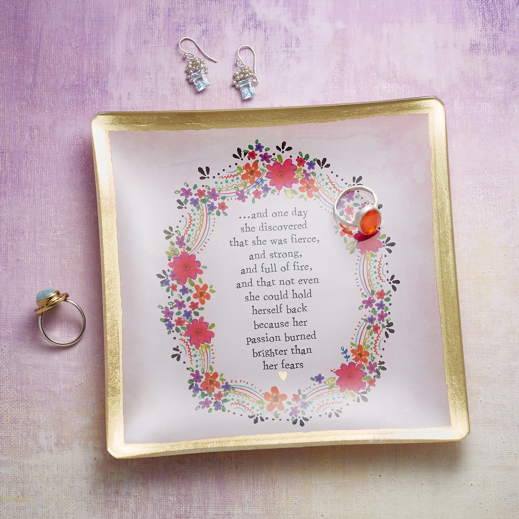 This glass dish offers a message of encouragement, a note of appreciation, a reminder to live with courage and passion. Painted glass with gold foil. Approx. 6″ sq.