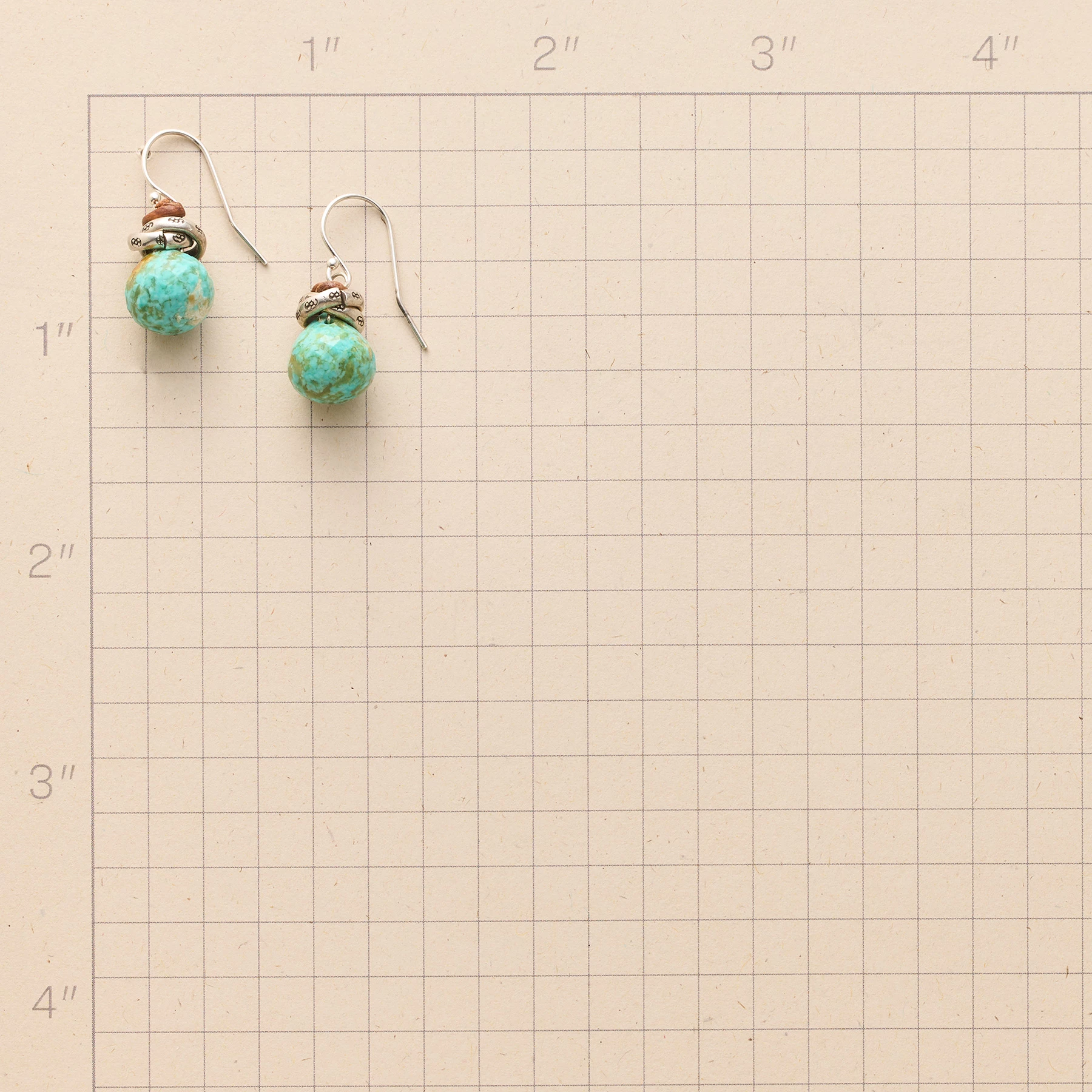 Thai silver beads made by hill tribe artisans orbit the top of tinted turquoise. Knotted to sterling silver French wires with brown leather. Handcrafted in USA. 7/8″l.