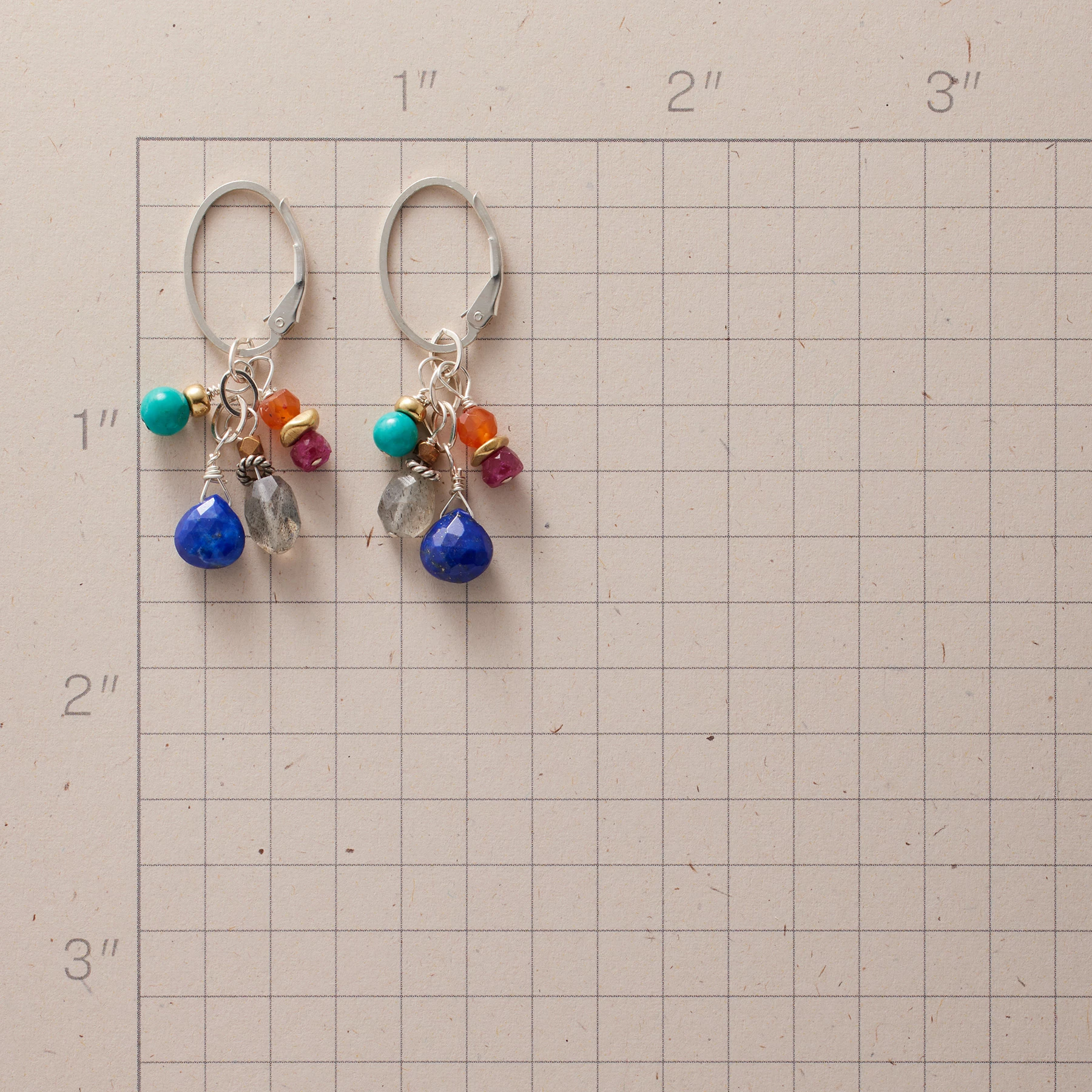 All the colors of the hearth, from blue-hot to blazing orange and red to soft, ashen gray. Accented with sterling silver links and brass beads, our earrings feature labradorite, carnelian, tinted and stabilized turquoise and ruby and stabilized lapis. Sterling self-locking hoops. Handcrafted in USA. Exclusive. 1-1/2″l.