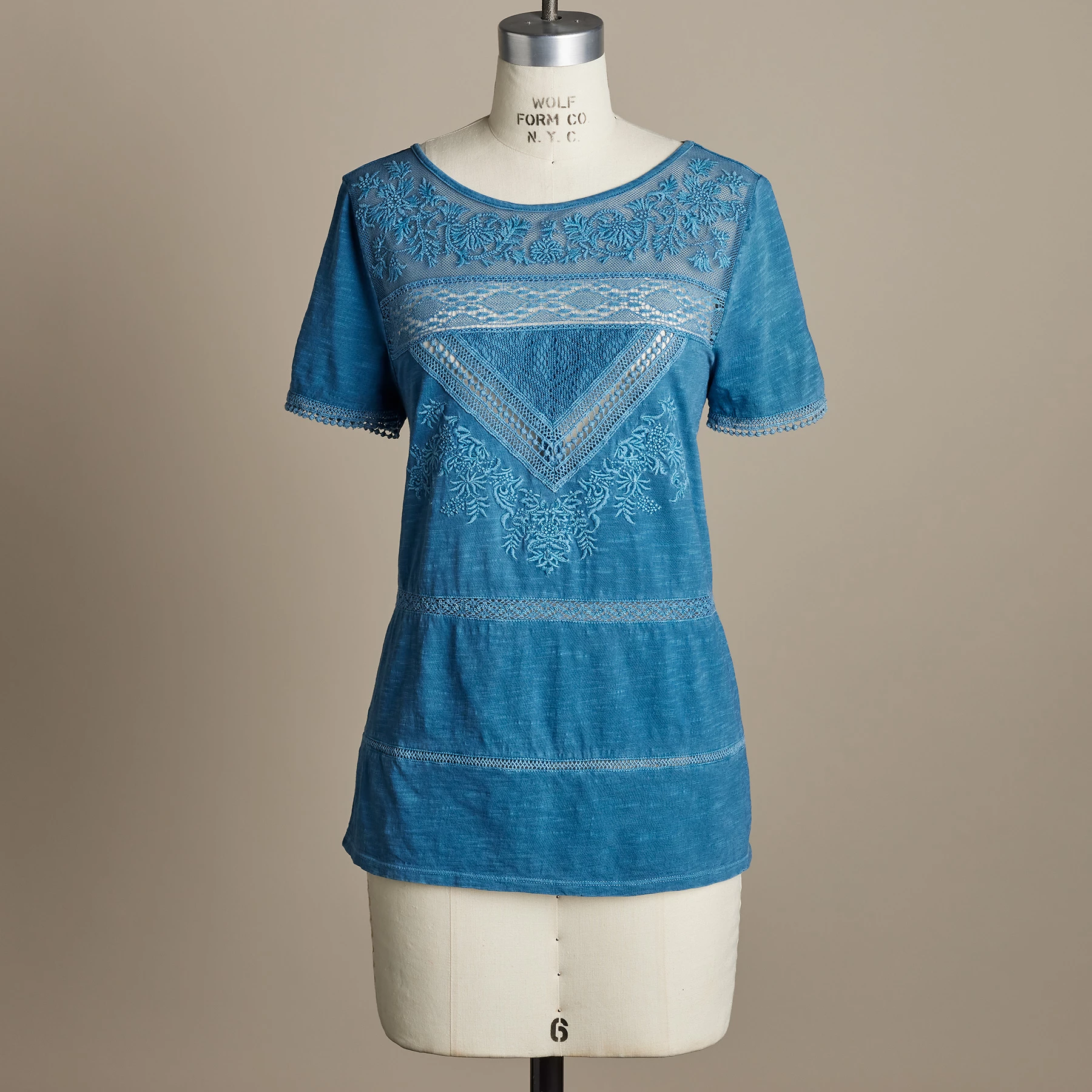 What a pretty tee, with embroidered cotton mesh yoke, lace inserts and trim, garment-dyed in a light wash. Slightly boxy fit. Cotton. Machine wash. Imported. Exclusive. Sizes XXS (00), XS (0 to 2), S (4 to 6), M (8 to 10), L (12 to 14), XL (16 to 18). Approx. 23-1/2″L.