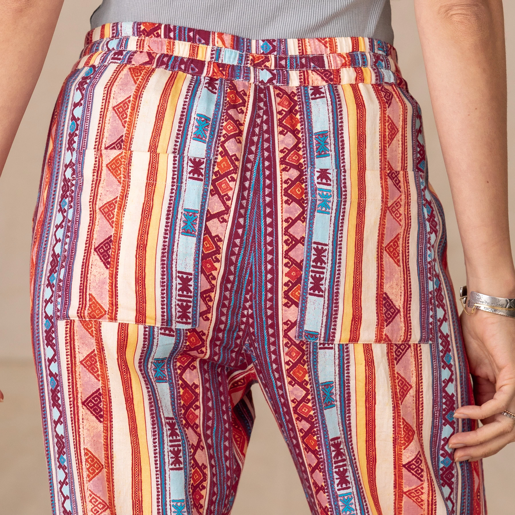 Joggers with on-the-go beachy style in a lively collage of prints, accented with tasseled, beaded waist ties; side seam pockets, and elastic waistband and cuffs. Cotton. Machine wash. Imported. Exclusive. Sizes XXS (00), XS (0 to 2), S (4 to 6), M (8 to 10), L (12 to 14), XL (16 to 18). 25-1/2″ inseam.