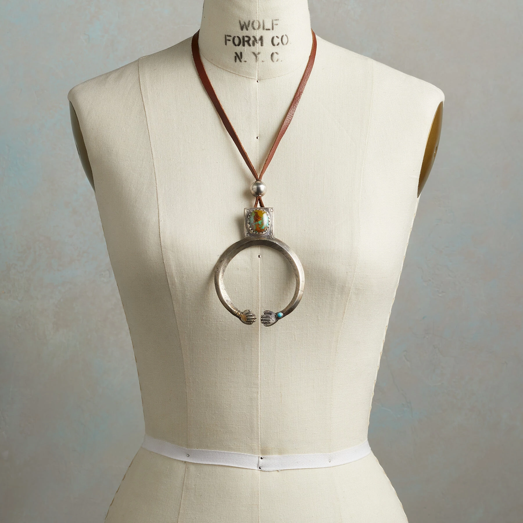 Drawing upon ancient traditions, Jesse Robbins handcrafted this one-of-a-kind necklace. The coin silver Naja pendant was cast in Tufa stone, resulting in the pendant’s subtle, rich texture. Turquoise from Nevada’s Cheyenne mine rests in a hand-cut sawtooth bezel and two hands, one set with turquoise, outstretched in the spirit of kinship. Knotted leather with coin silver slider bead. Made in USA. Exclusive. Approx. 38″L, Bead 9/16″ dia.; naja 4″L x 3″W.