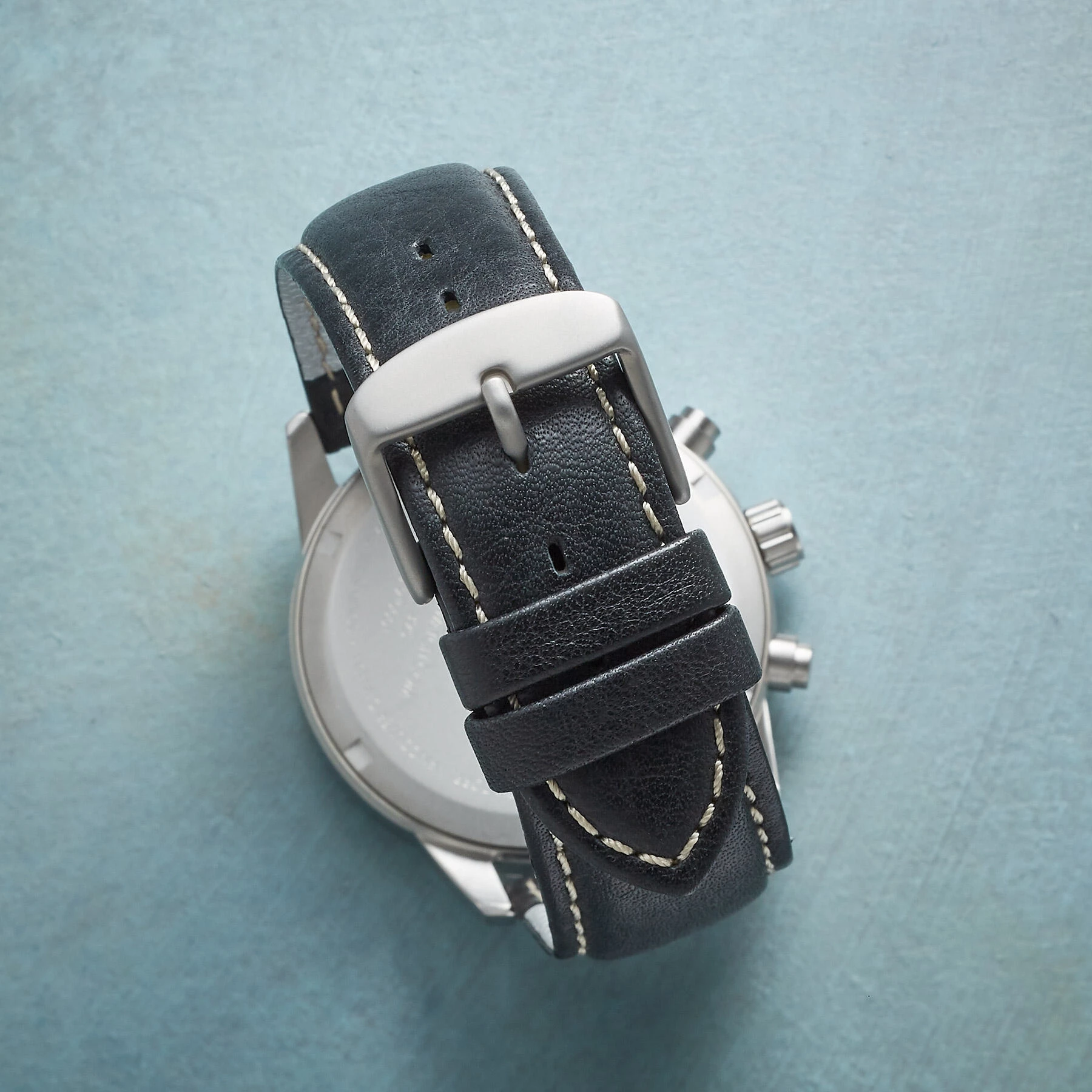 A sleek, streamlined version of the classic pilot watch, this hardy chronograph watch foregoes the the bulk but keeps the features you want – solid, stainless steel case, ultra-scratchproof sapphire crystal, easy-to-read face with luminous dial, Japanese quartz movement, reliable waterproof performance and a seriously supple Italian leather band. Made in USA. Fits wrists 7-1/4″ to 8-1/2″, 1-7/8″ dia. case.