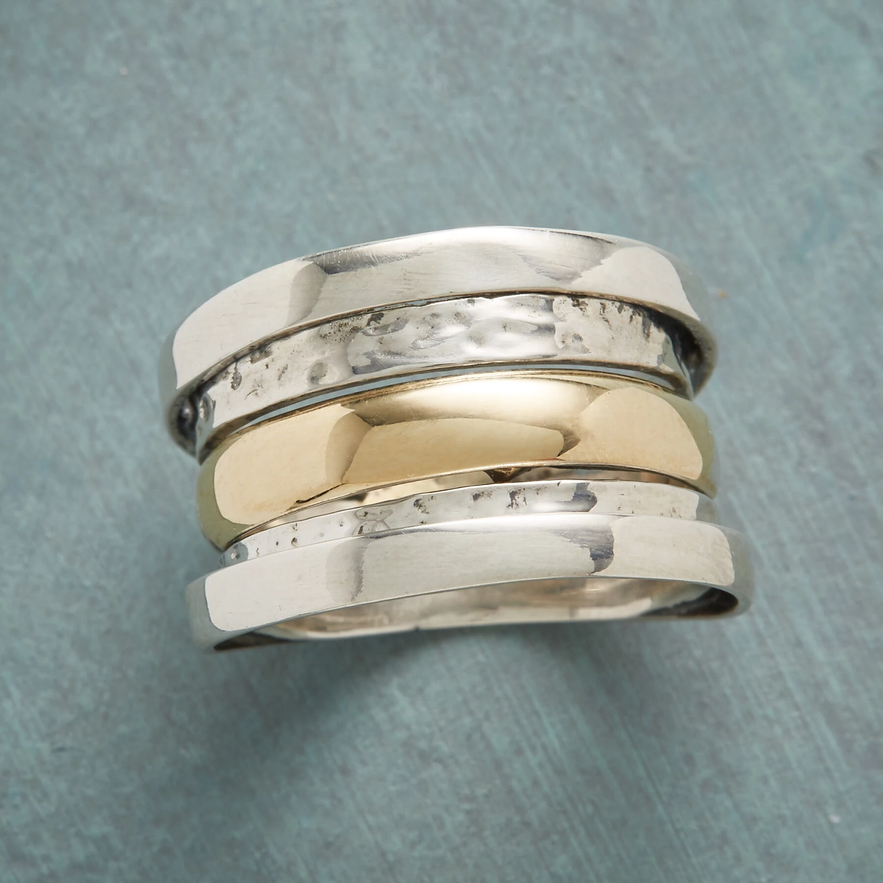 Stacked layers of smooth and textured sterling silver set off a central stripe of 14kt gold. Exclusive. Handcrafted in whole sizes 5-9. 5/8″ tapers to 5/16″w.