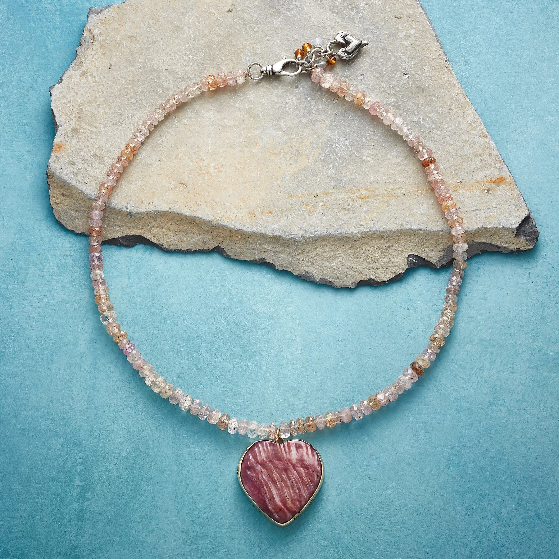 Variegated topaz gems uphold Jes MaHarry’s spiny oyster shell heart, the back engraved, “Love & Joy.” 14kt gold bezel; sterling silver backing and lobster clasp. Exclusive. Handmade in USA. 17″L. Heart 1-1/4″ dia.