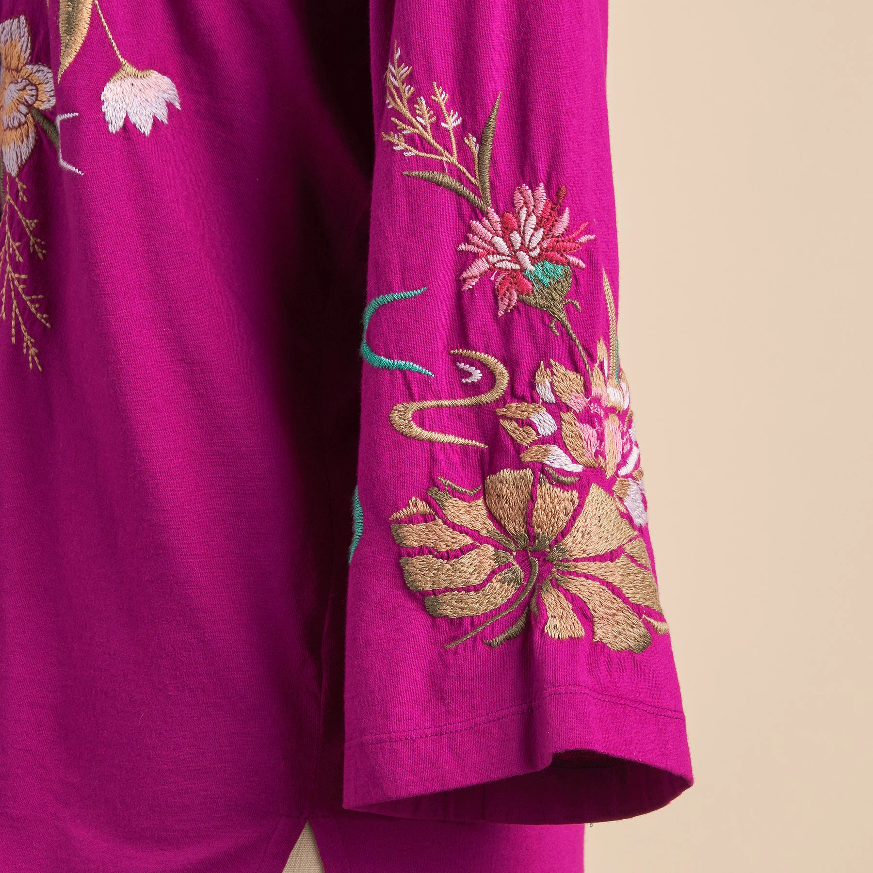 Lushly embroidered with florals and hummingbirds, this natural shell button henley has side slits and 3/4 length sleeves. Plain back. Cotton. Machine wash. Imported. Sundance exclusive. Sizes XXS (2), XS (4), S (6), M (8–10), L (12), XL (14). Approx. 24.75″l.