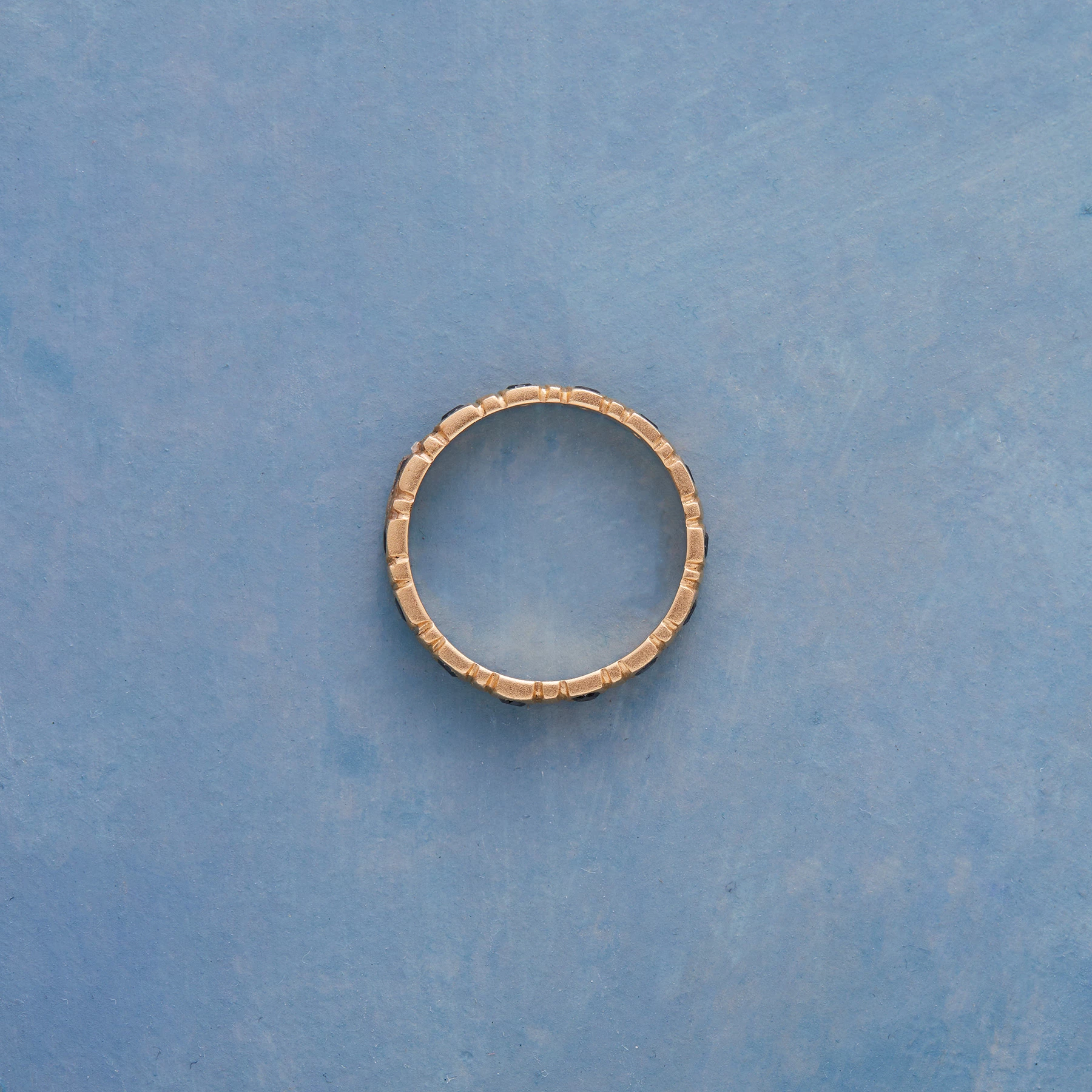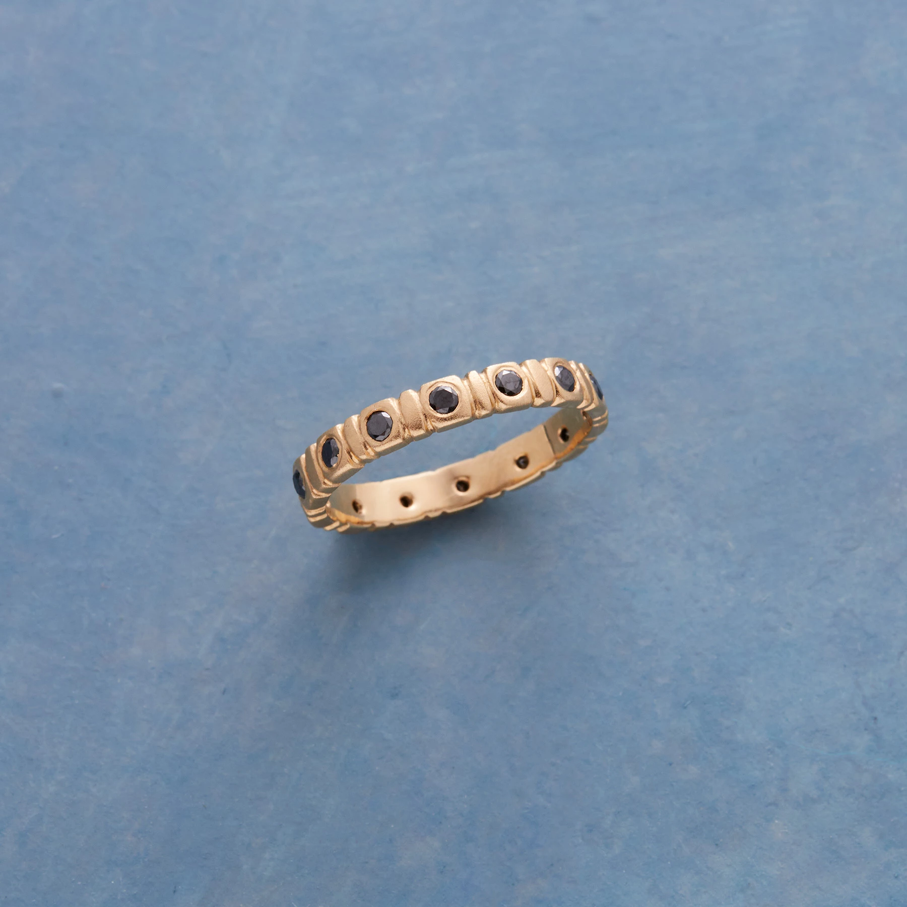 From Shaesby Scott, a circular pathway of rose-cut black diamonds embedded in 14kt gold, the metal burnished to a subdued satin finish. Handmade in USA. Whole sizes 5 to 9.