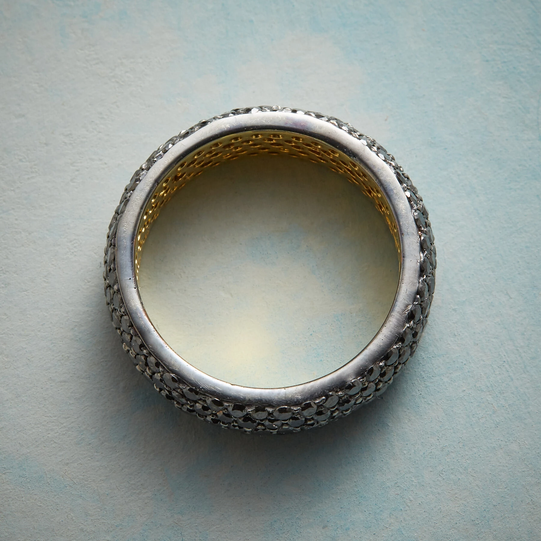 Like a slice of velvety night sky, hundreds of black diamonds scintillate around our showstopper ‘Midnight Light’ band ring lined with 18kt gold plate. Exclusive. Whole sizes 5 to 9.