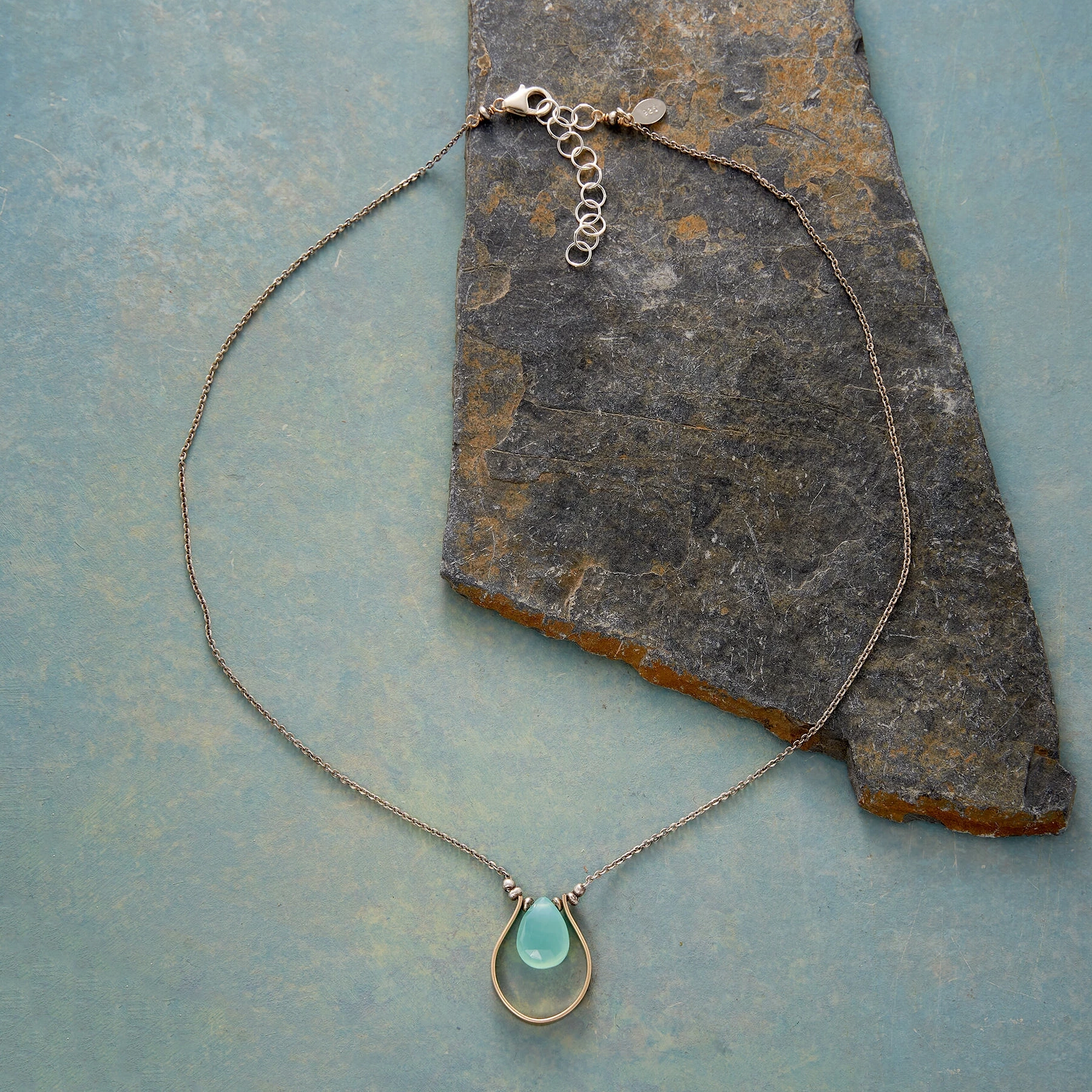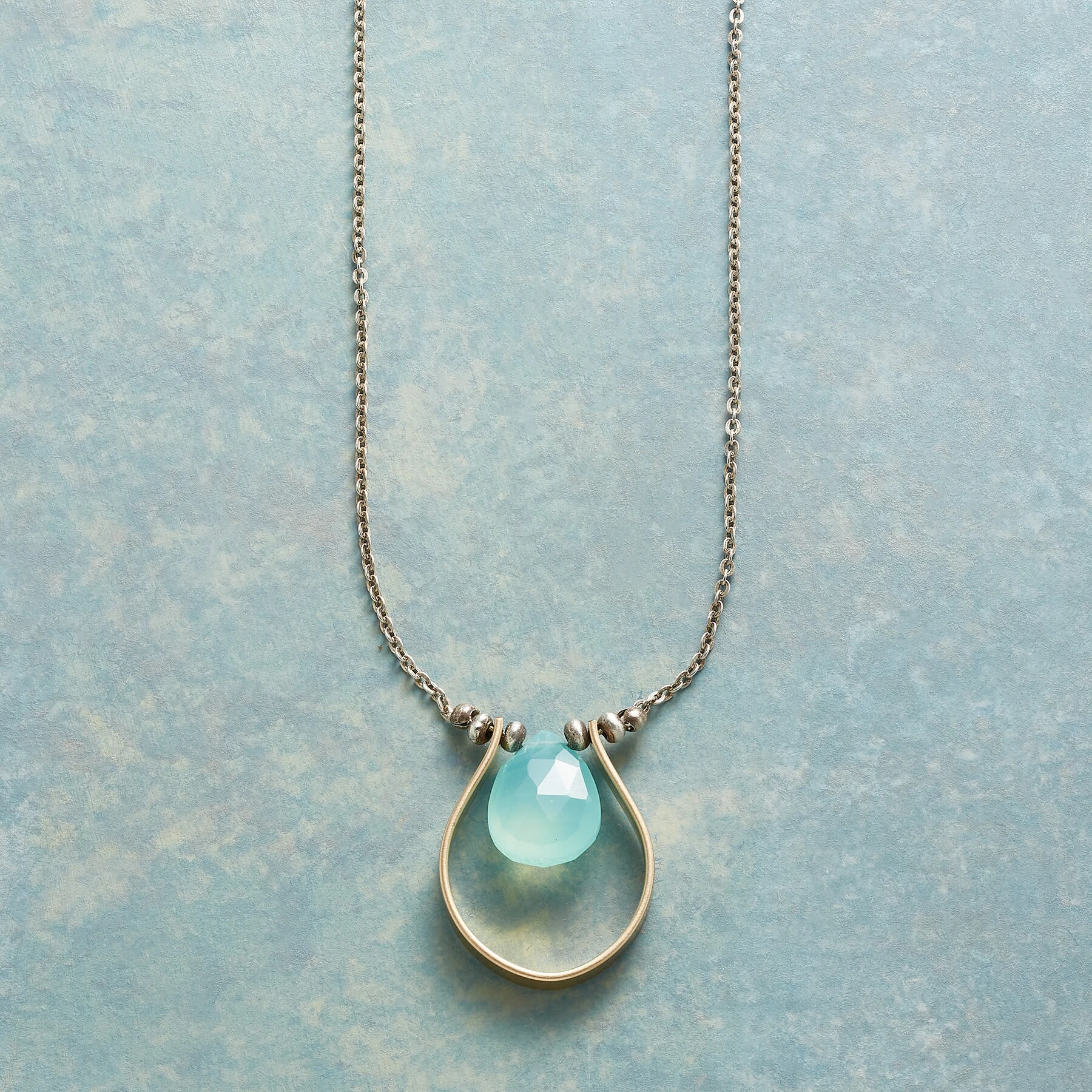 Pinned within a stylized 14kt gold-filled horseshoe hoop, chalcedony radiates good fortune. Exclusive. Handcrafted in the USA with sterling silver beads, links, lobster clasp. 18″ to 20″L. 7/8″ drop.