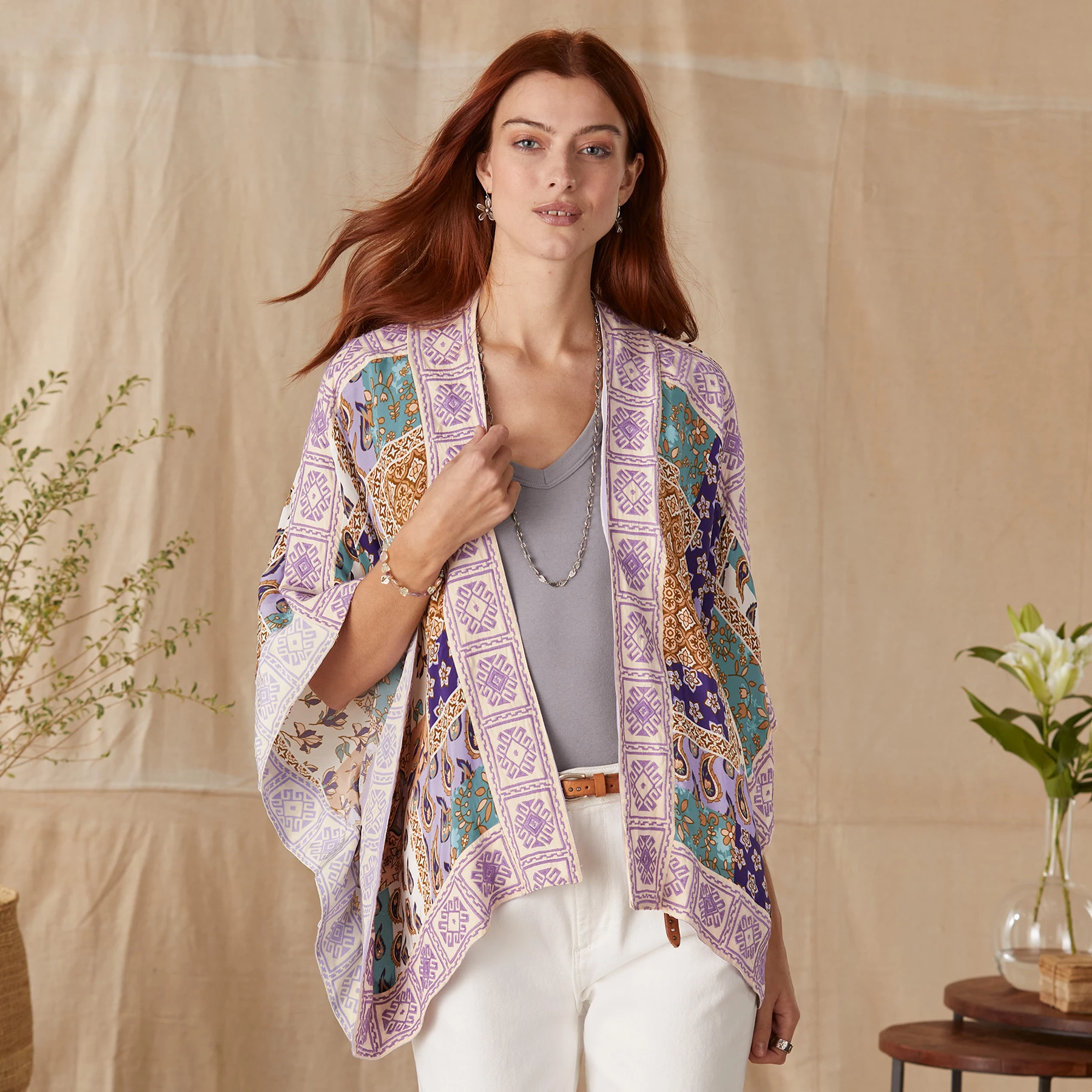 This graceful kimono in mixed prints with geometric contrasting trim floats in a light, flowing outer layer. Cupro. Machine wash. Imported. One size. Approx. 24-1/2″L.