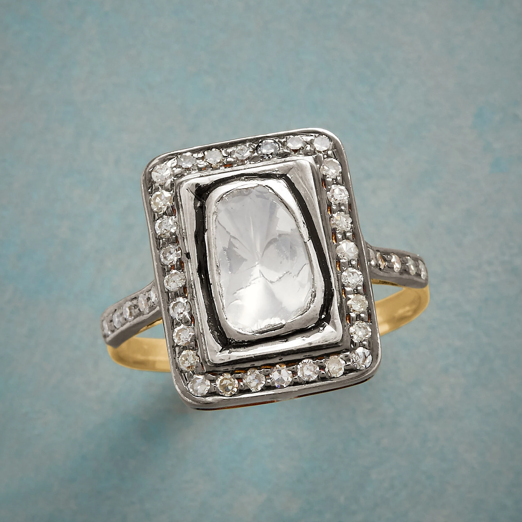 A show-stopper Polki diamond is surrounded by sparkling pavé diamonds in this handmade, Victorian-inspired ring, set in contrasting black ruthenium. 18kt gold band. Whole sizes 59*.