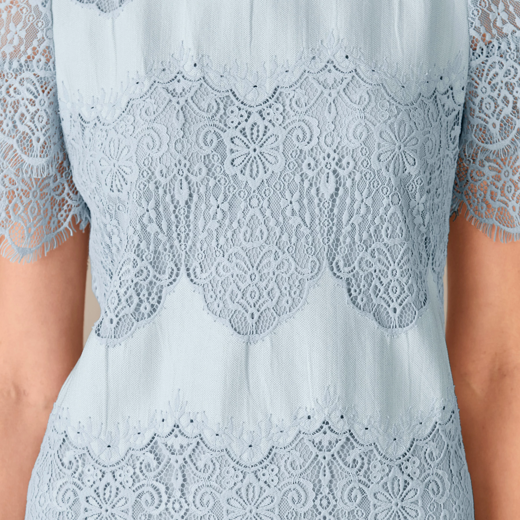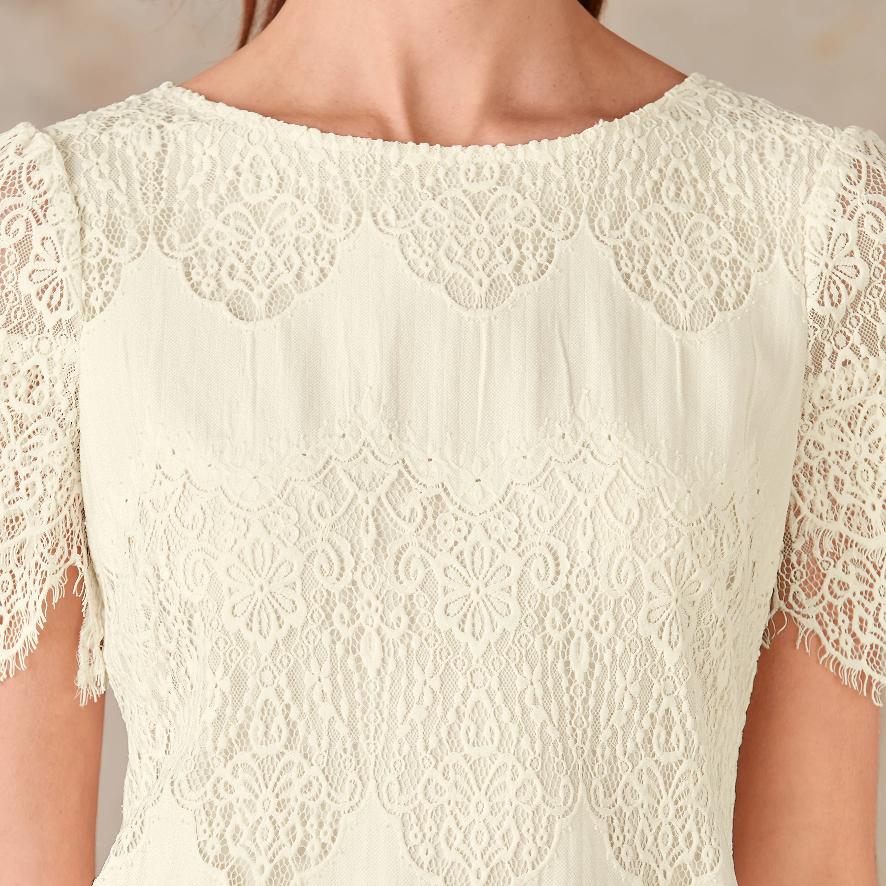 Embroidered lace shift dress with alluring deep back V with zipper, scalloped sleeves and hem. Fully lined. Nylon. Hand wash. Imported. Exclusive. Sizes XS (0 to 2), S (4 to 6), M (8 to 10), L (12 to 14), XL (16 to 18), XXL (20 to 22). Approx. 38″L.