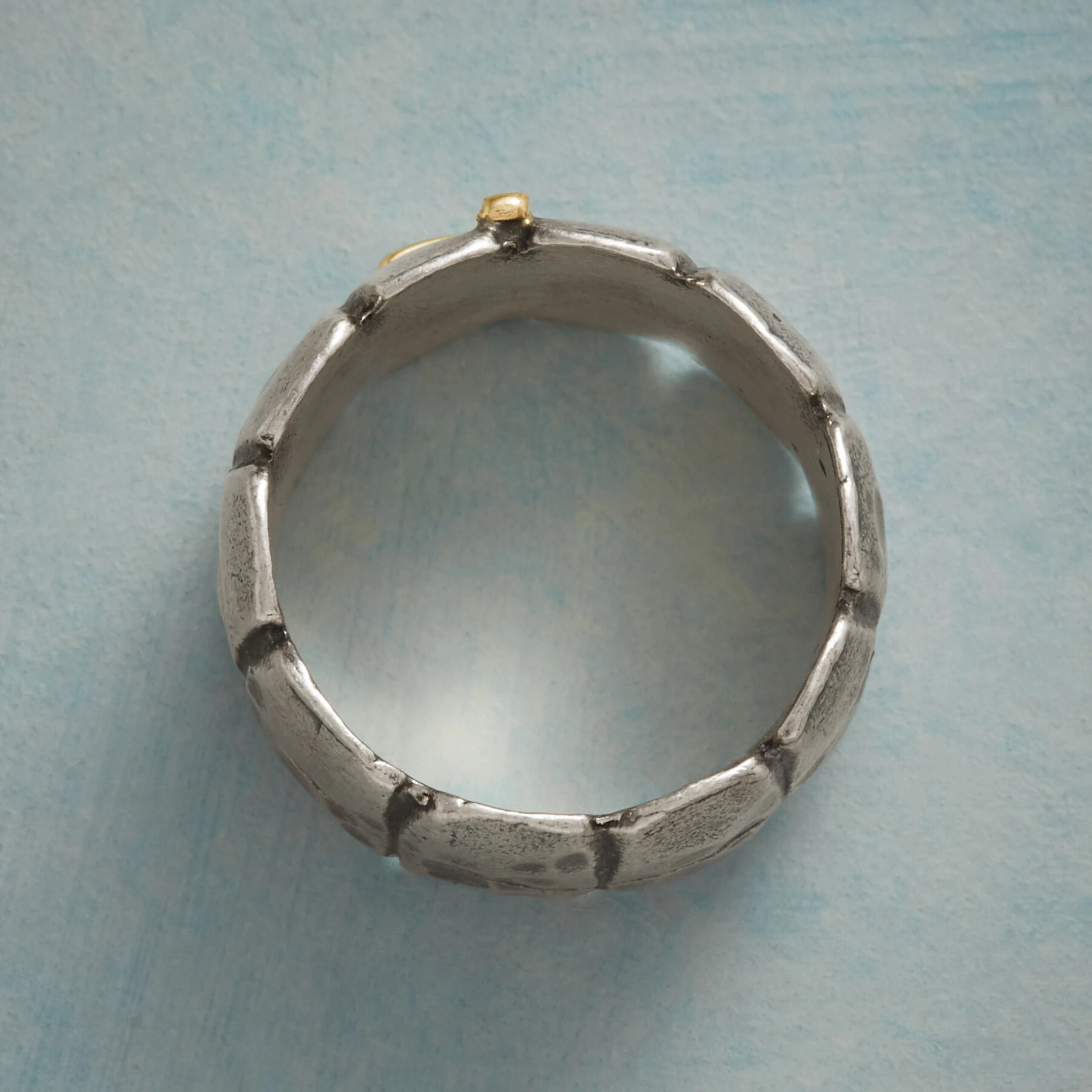 This ring’s burnished sterling silver ‘bricks’ and 14kt gold cross were prompted by the artist’s visit to an ancient place of worship. Handmade. Exclusive. Whole sizes 5 to 9. 1/2″W.