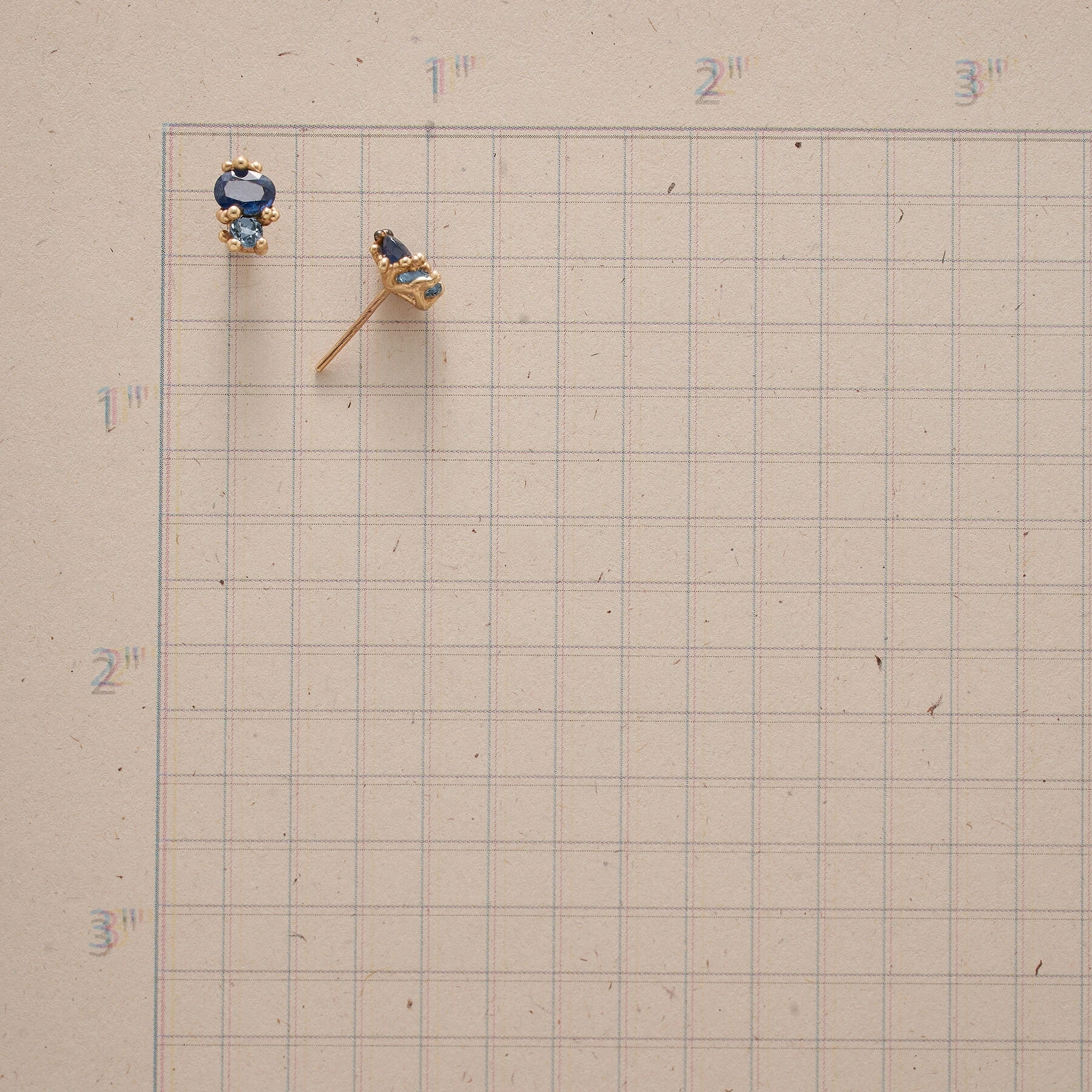 These ethereal 14kt yellow gold earrings by Ruth Tomlinson bring together sapphire and aquamarine with the gleam of gold granules, each delicately handcrafted to hug the stones and highlight their heavenly blue. 5/16″L.