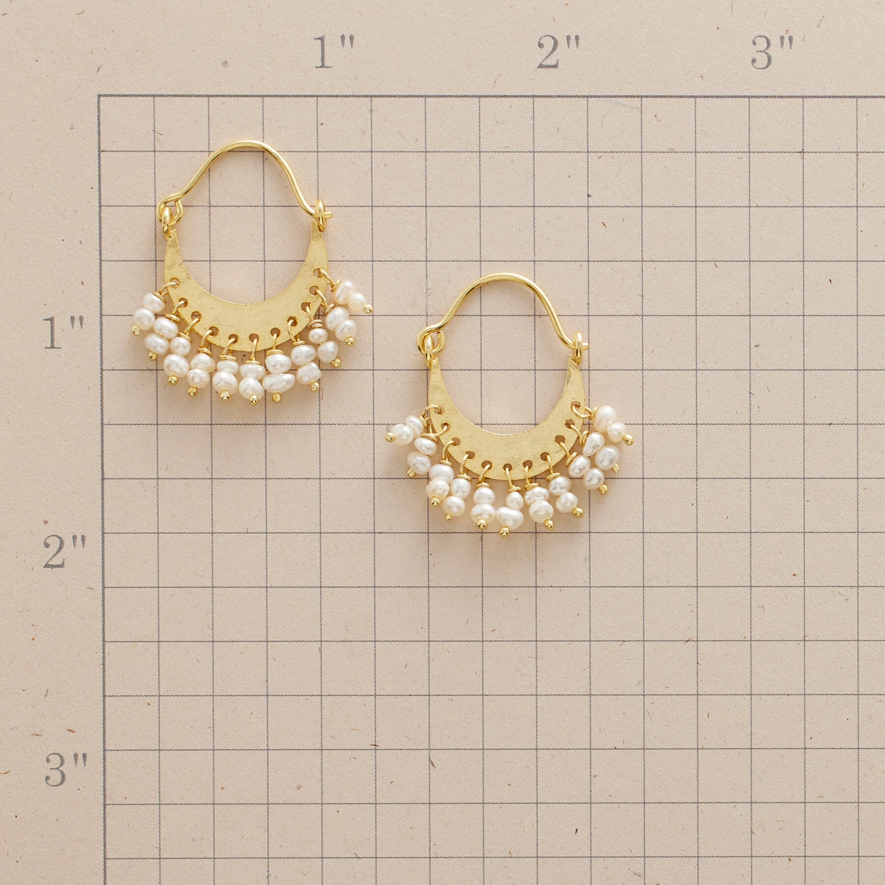 Hammer marks bounce light off crescent hoops, accentuated by a cultured freshwater pearl ruffle. Handcrafted in 22kt gold-plated sterling silver. Hinged wires. 1-1/4″L.