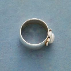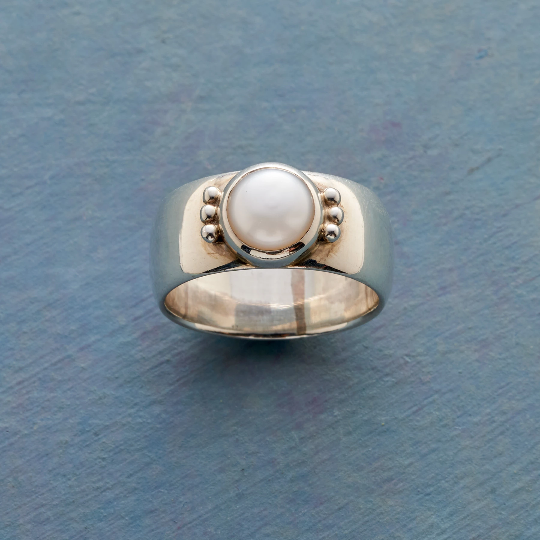 Our wide, sterling silver band welcomes a cultured freshwater pearl. Granulation bead trios flank the gem. Handmade. Exclusive. Whole sizes 5 to 9. Approx. 3/8″W.