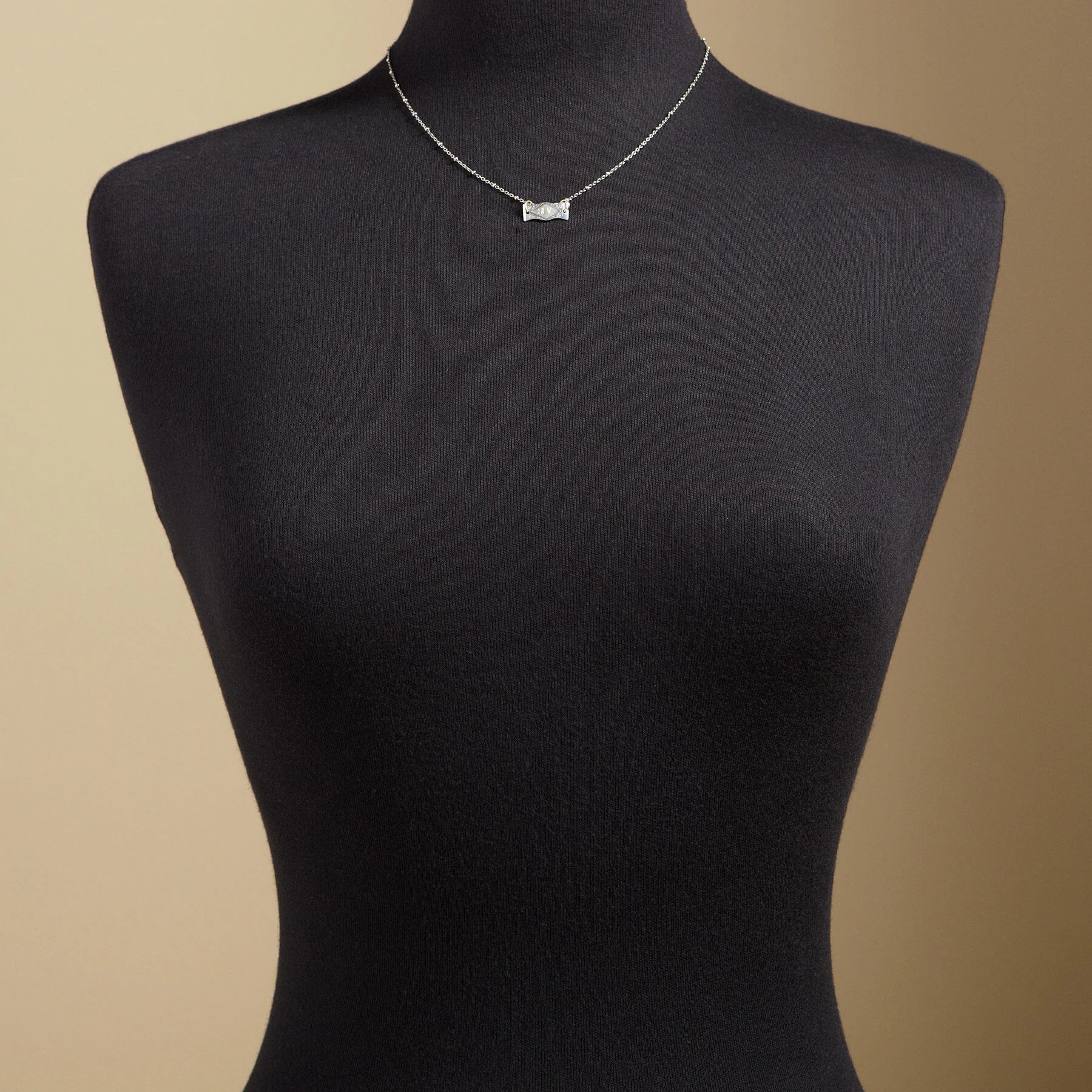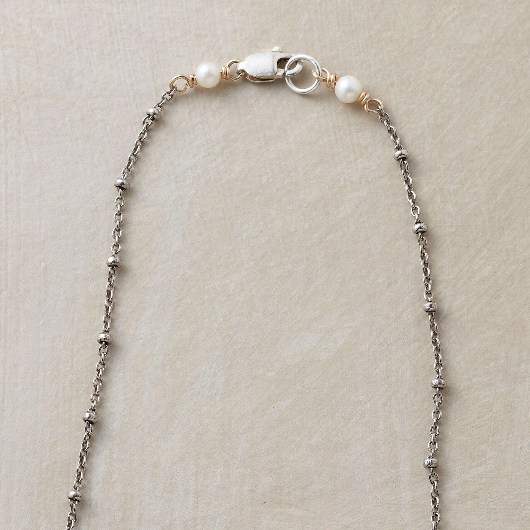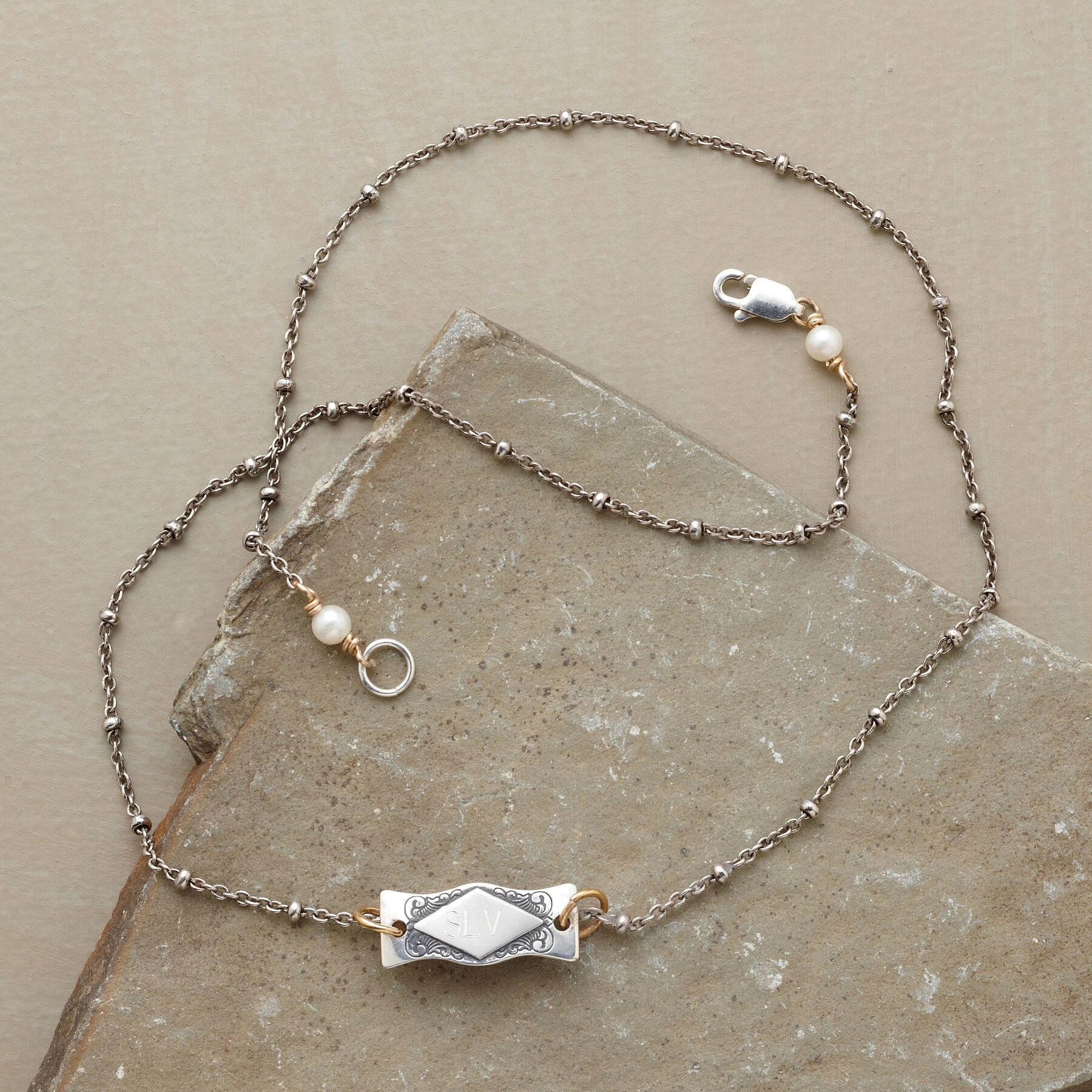 A personalized ID tag necklace handcrafted to recall Victorian jewels, its delicate cartouche ID tag flanked by scrolled etchings and suspended from 14kt gold-filled jump rings. Cultured freshwater pearls at lobster clasps. Made in USA of sterling silver. Personalized with up to three uppercase block initials (letters only, no special characters or symbols). 16″L, 5/8″ x 1/4″ tag.