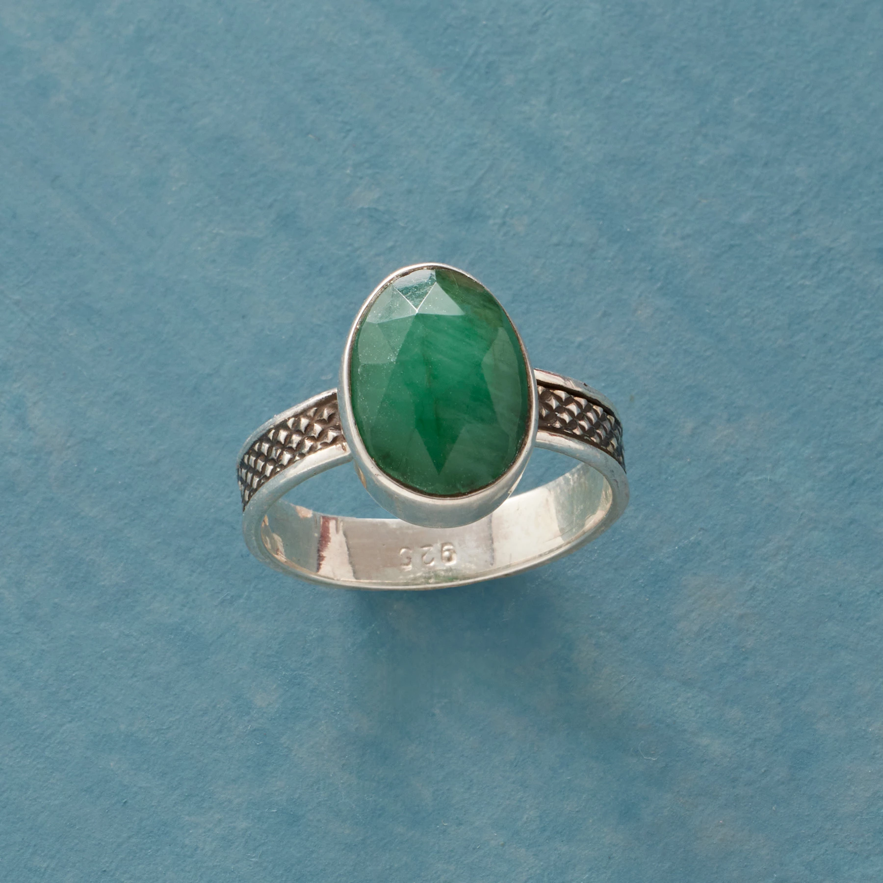 A verdant emerald tops our knurled sterling silver band, capturing the beauty of the forest in a few deft strokes. Handmade. Exclusive. Whole sizes 5 to 9.