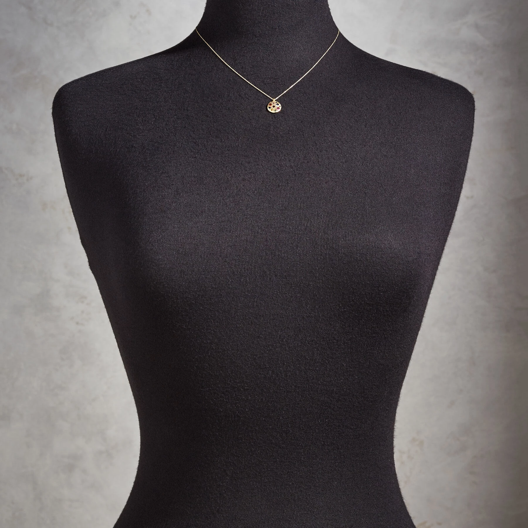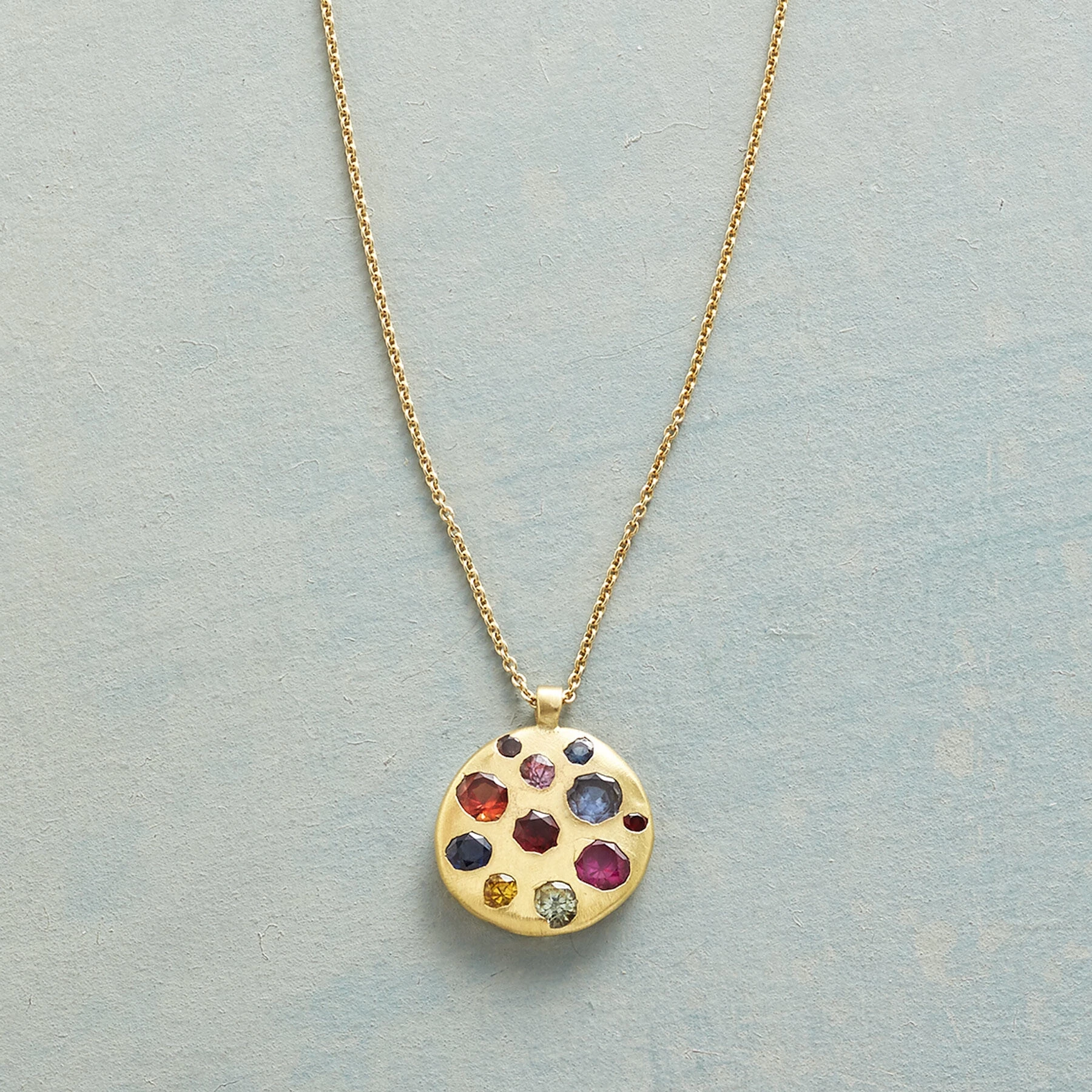 Polly Wales creates simple splendor, scattering rainbow colored sapphires on a disk of matte 18kt yellow gold. Wear it with everything, from jeans to your favorite LBD. 18kt gold chain with handmade S-hook closure. Handcrafted in USA. 17″L.