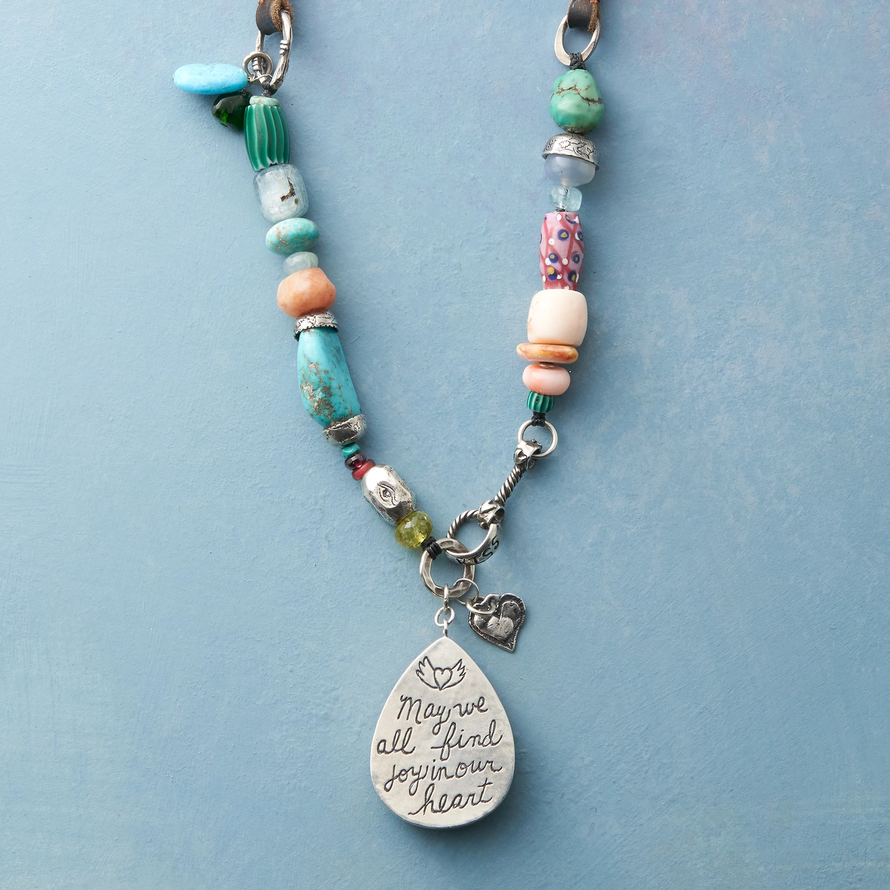 Wrapped in a 14kt gold bezel, a lapis teardrop centers a joyful strand of rare trade beads and coral, turquoise nuggets, chrome diopside, peach moonstone and more, interspersed with links, charms and bead caps handcrafted from sterling silver. The pendant’s sterling back reads “May we all find joy in our heart.” Leather laces with sterling slider. Designed by Jes MaHarry. Handmade in USA. Exclusive. Adjustable to 34″L, 2-3/8″ drop.